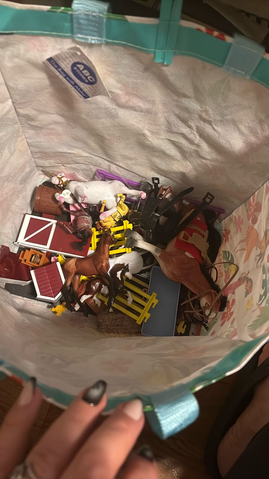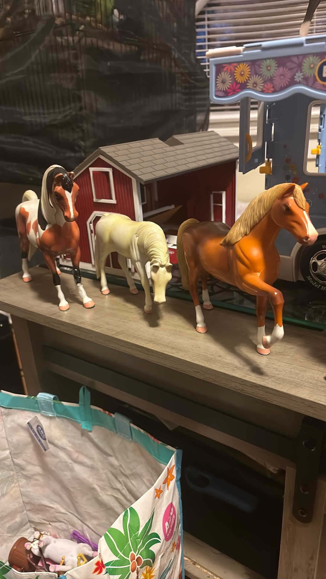 Everything in the picture has been played with gently and still in good condition for any Lil person that loves horses, includes barn, unassembled, mini trailer, stablemate, horses, and six classic Breyer horses as well as some extras in the bag