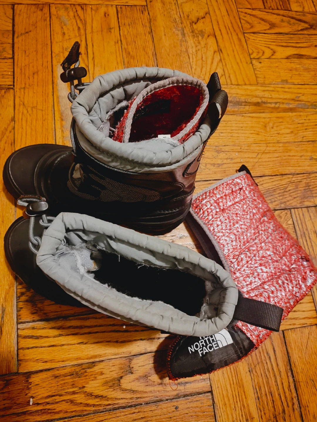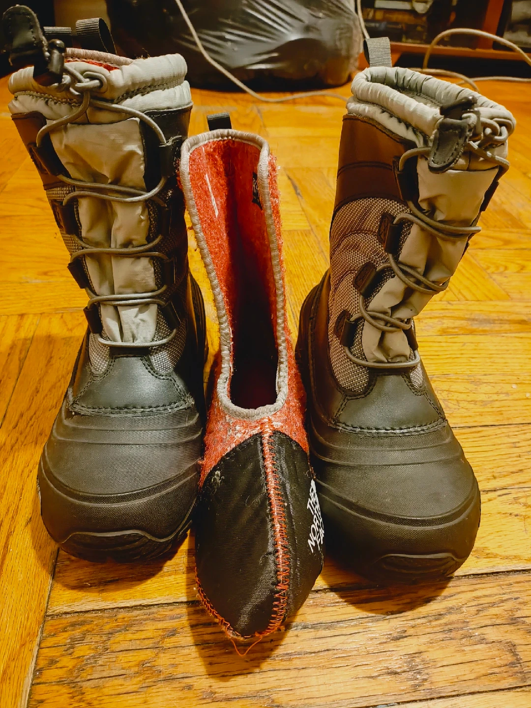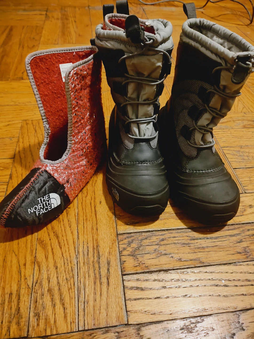 Selling a pair of The North Face kids' snow boots. They are in good condition and ready for some winter adventures! The boots are black and gray with a removable red and black liner.
