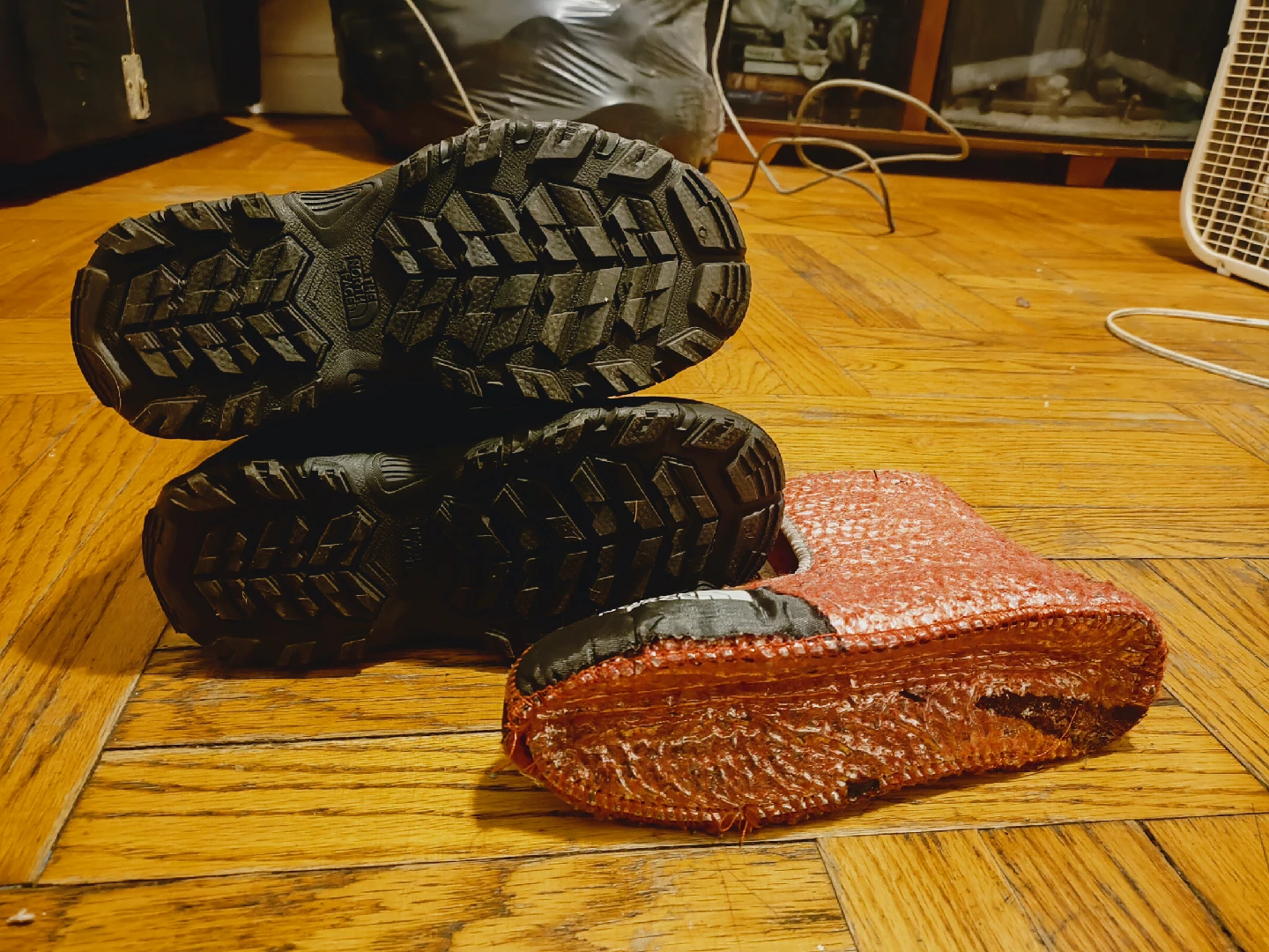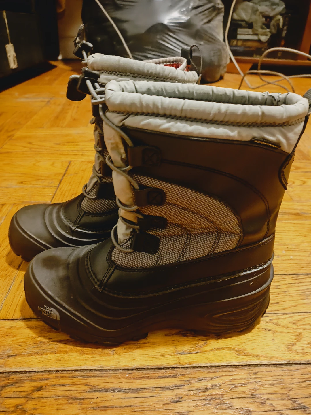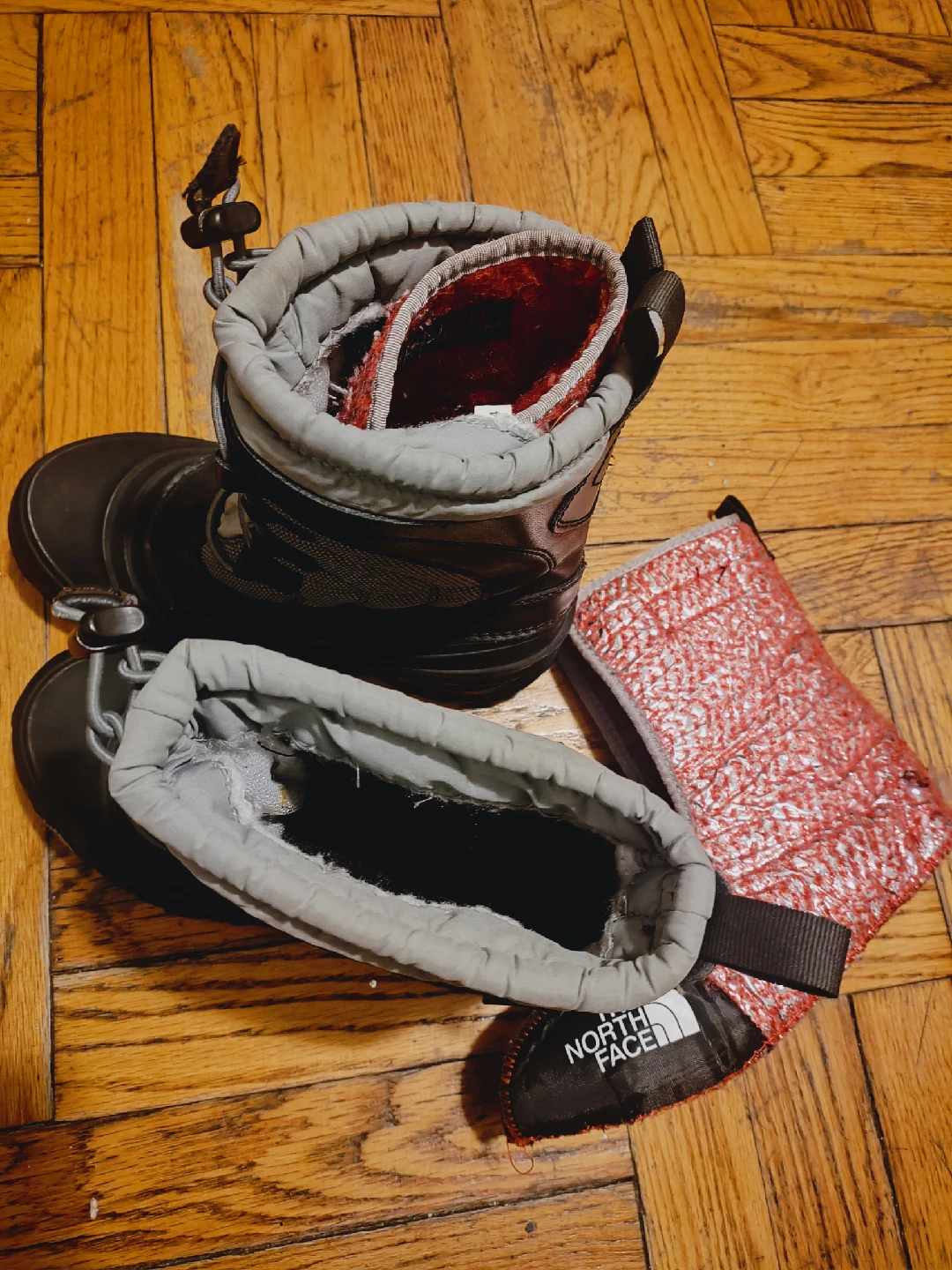 Selling a pair of The North Face kids' snow boots. They are in good condition and ready for some winter adventures! The boots are black and gray with a removable red and black liner.