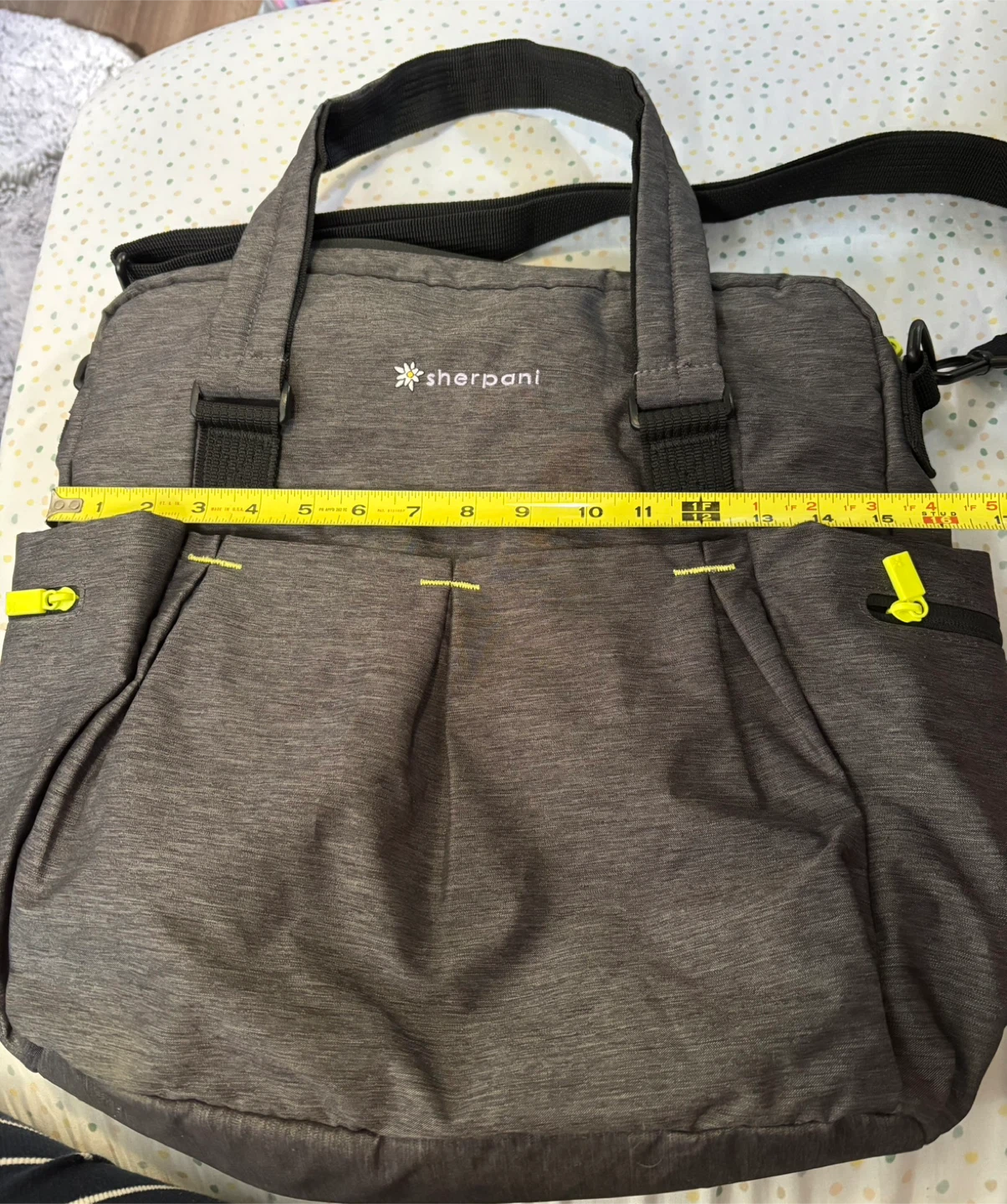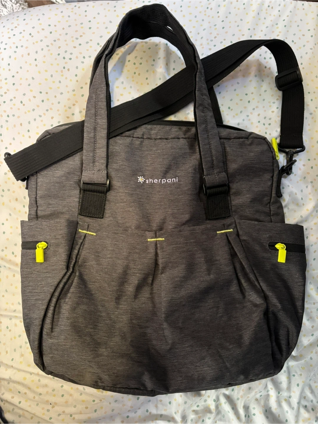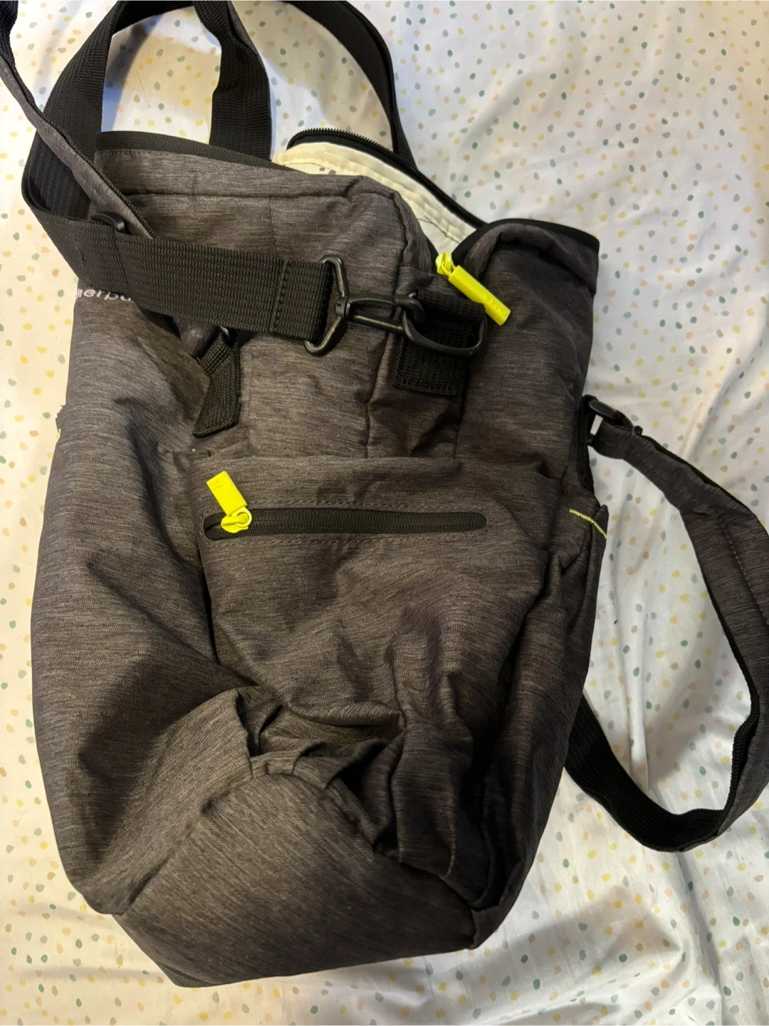 It features a heathered gray colour with bright yellow zipper pulls. It has both short handles and a long adjustable shoulder strap.