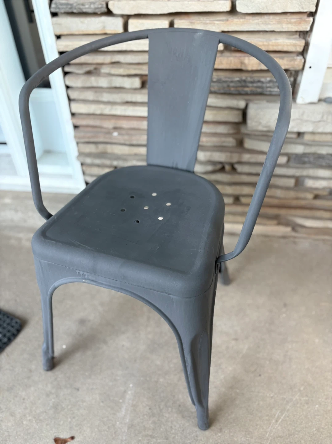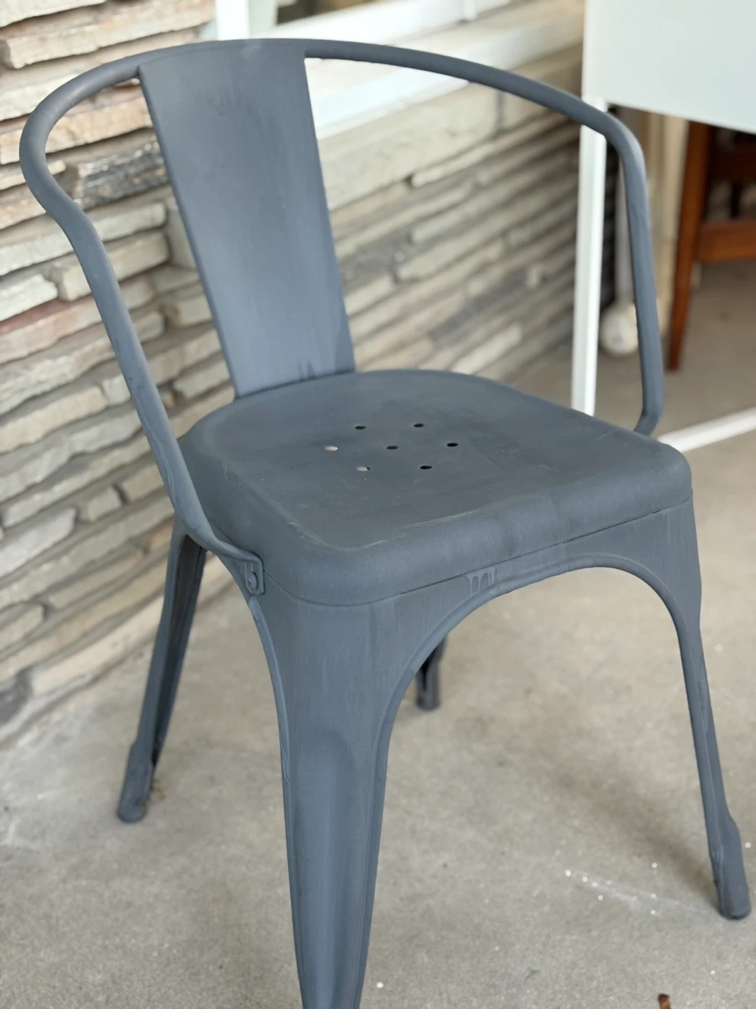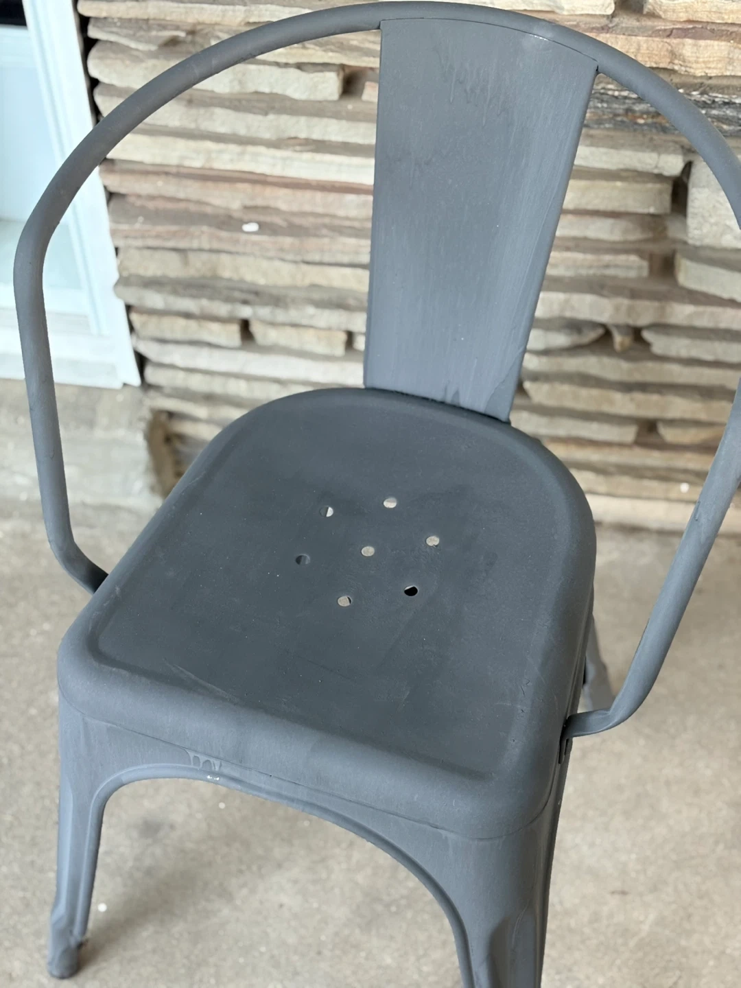 Here's a grey metal chair which is painted with ultra chalked Matt color , similar to the Tolix style! It's a sturdy and stylish piece that would look great in a kitchen, dining area, or even outdoors. It has a simple design with a curved back and armrests, and a seat with a few small holes. It's in good condition and ready for a new home