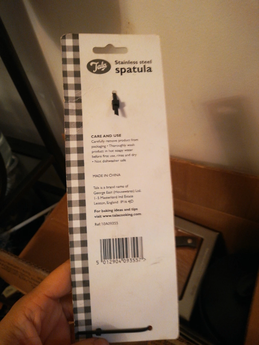 I'm selling a brand new Tala stainless steel spatula, still in its original packaging! It's perfect for baking and cooking needs. The packaging includes care and use instructions, and notes that it's made in China