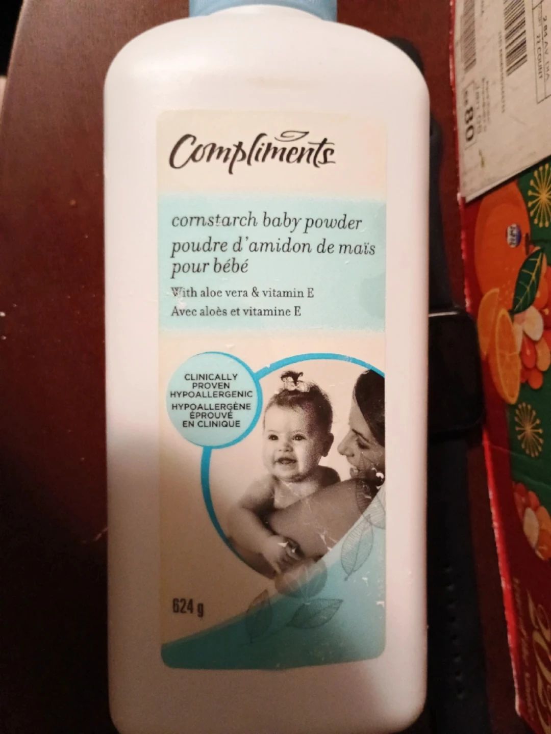 This is a half bottle of Compliments cornstarch baby powder. It contains aloe vera and vitamin E, and is clinically proven hypoallergenic.
