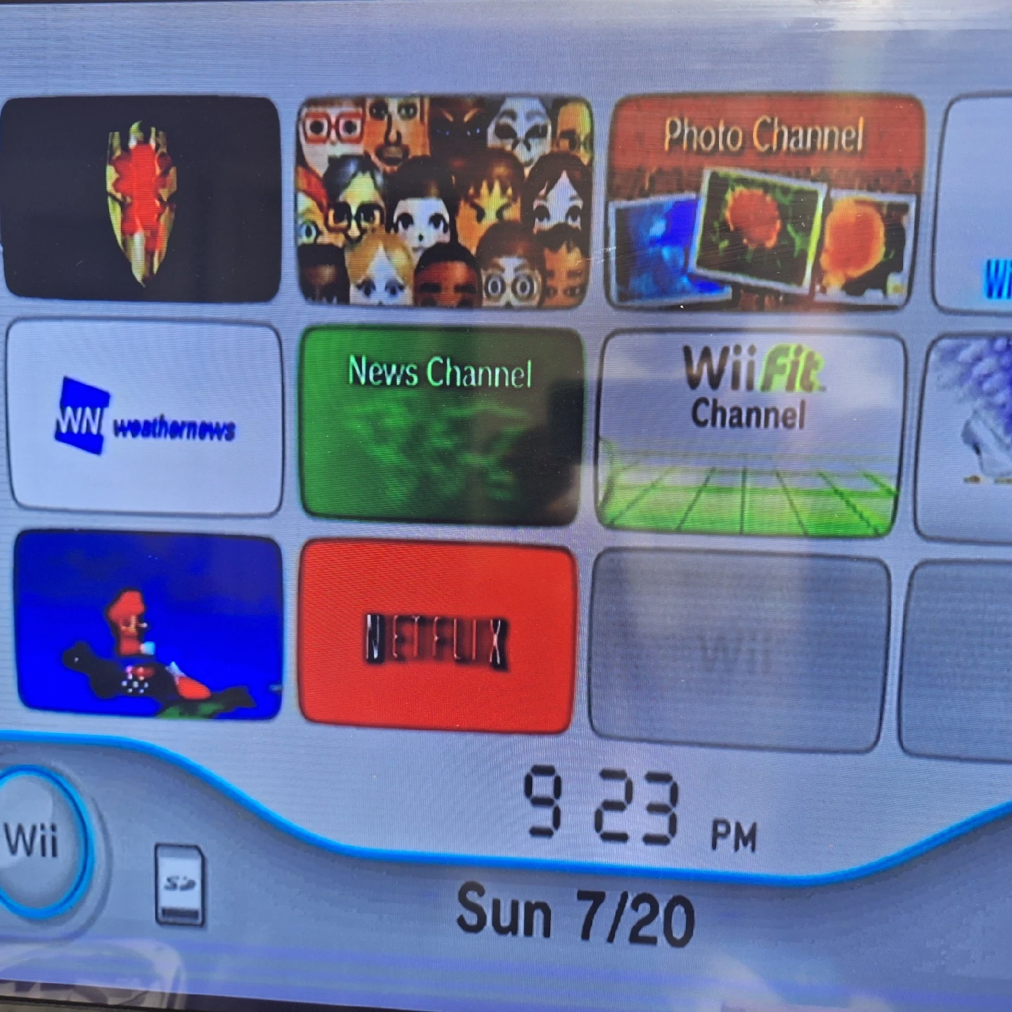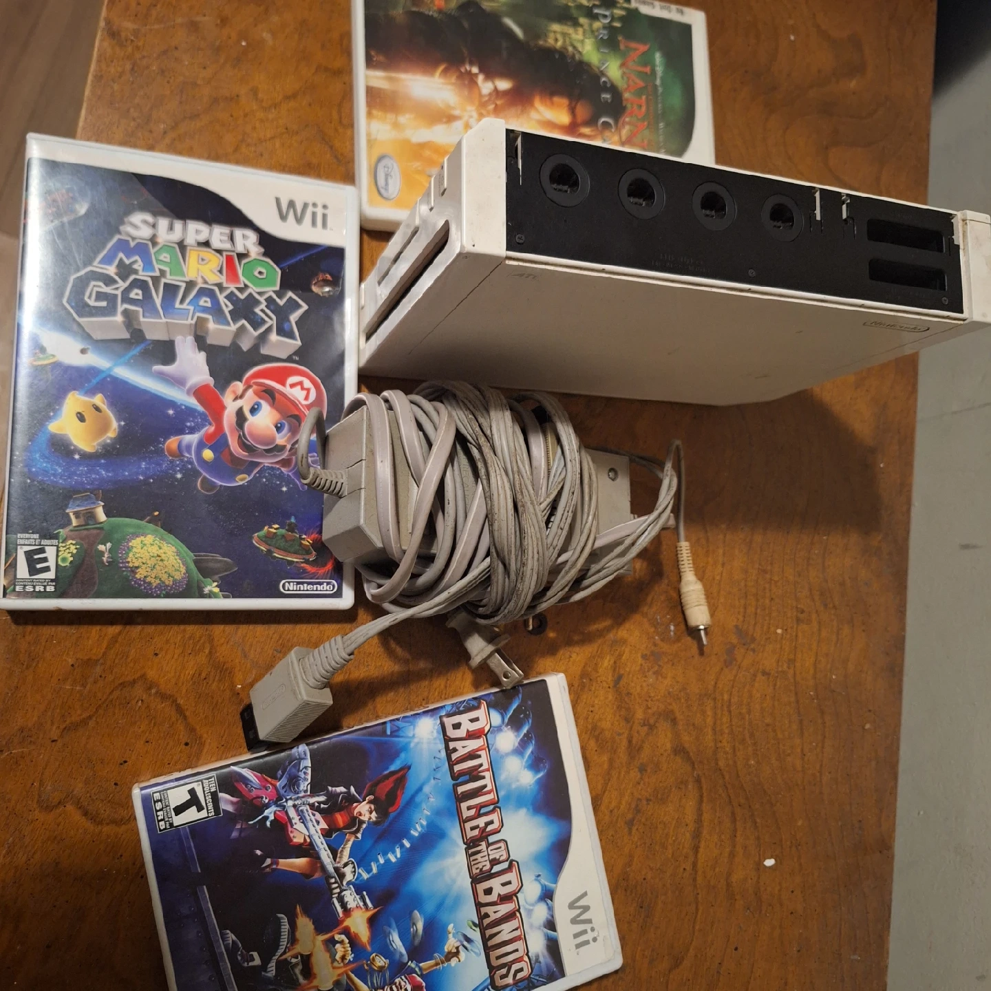 Selling a used Nintendo Wii console. Includes the console, power cable, and three games: Super Mario Galaxy, Battle of the Bands, and Narz