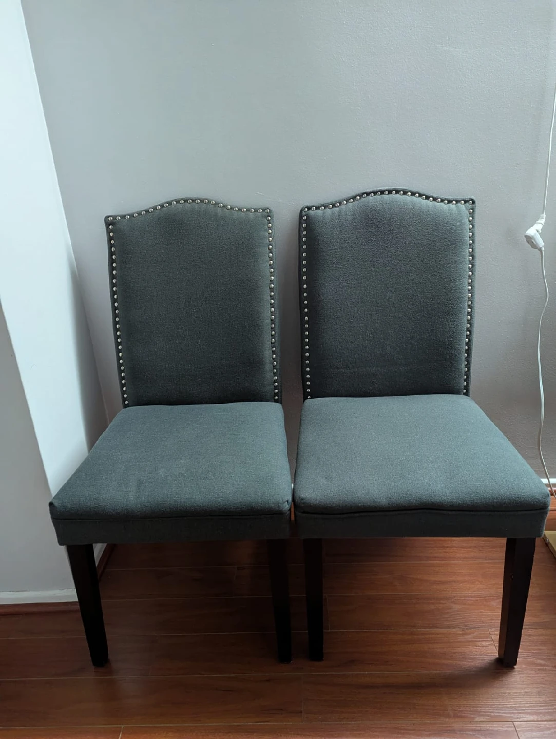 Selling a set of two dining chairs. They have a nice grey upholstery and dark wood legs. They would be a great addition to any dining room or kitchen! π₯