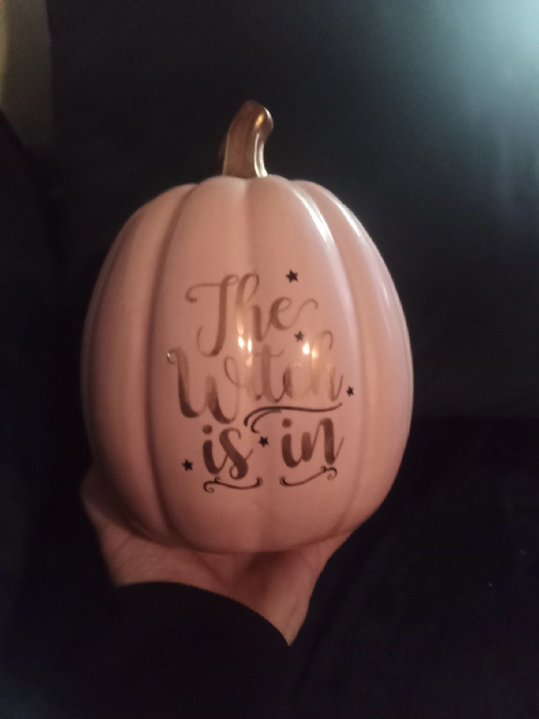 167Cute Halloween pumpkin decoration! It's a light pink colour with gold lettering that says 'The Witch is in'. Perfect for adding a bit of spooky fun to your home this October