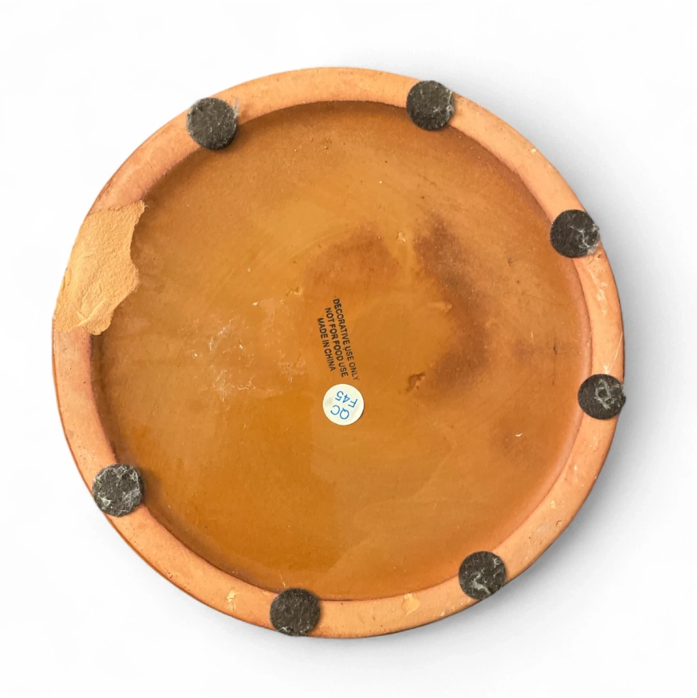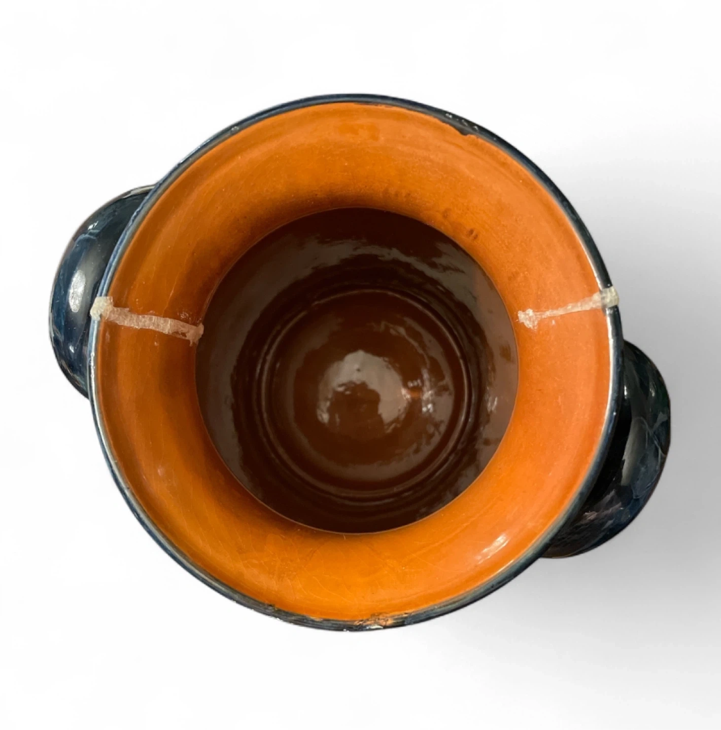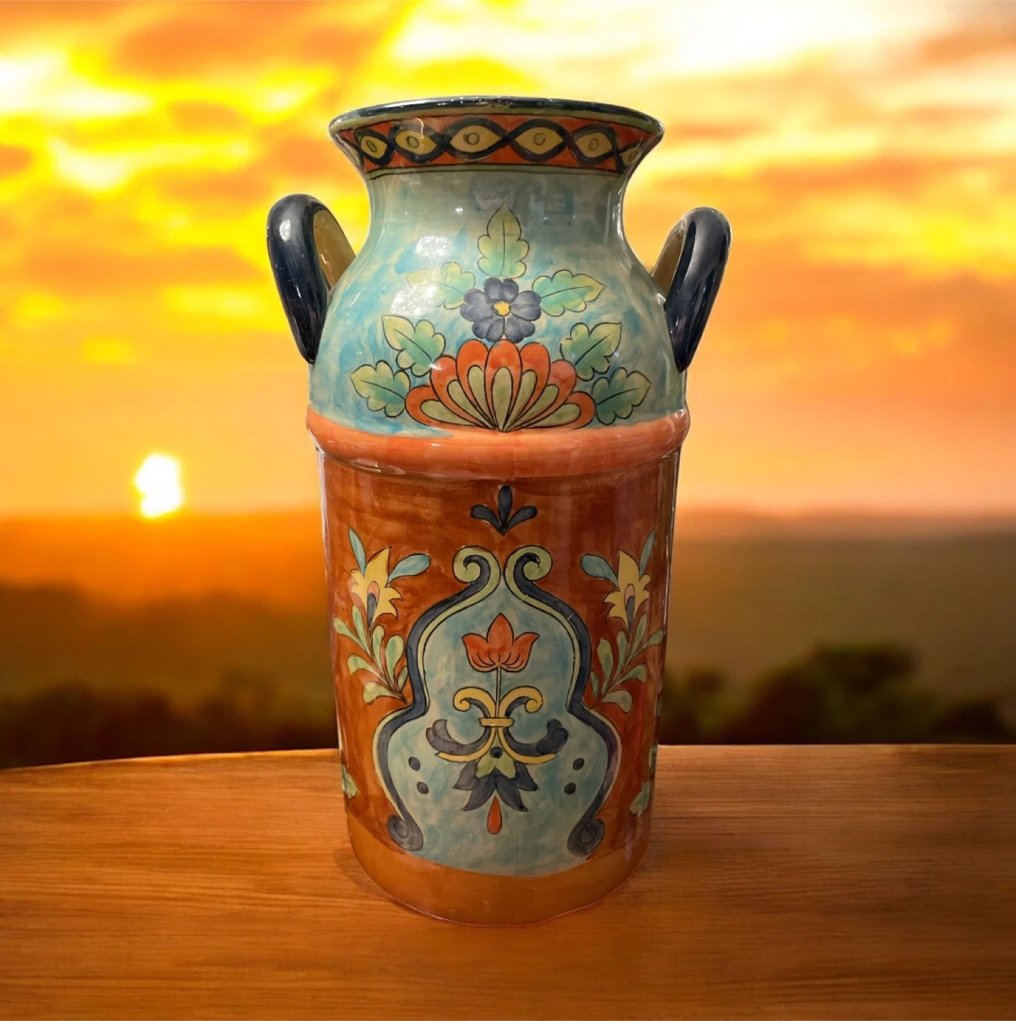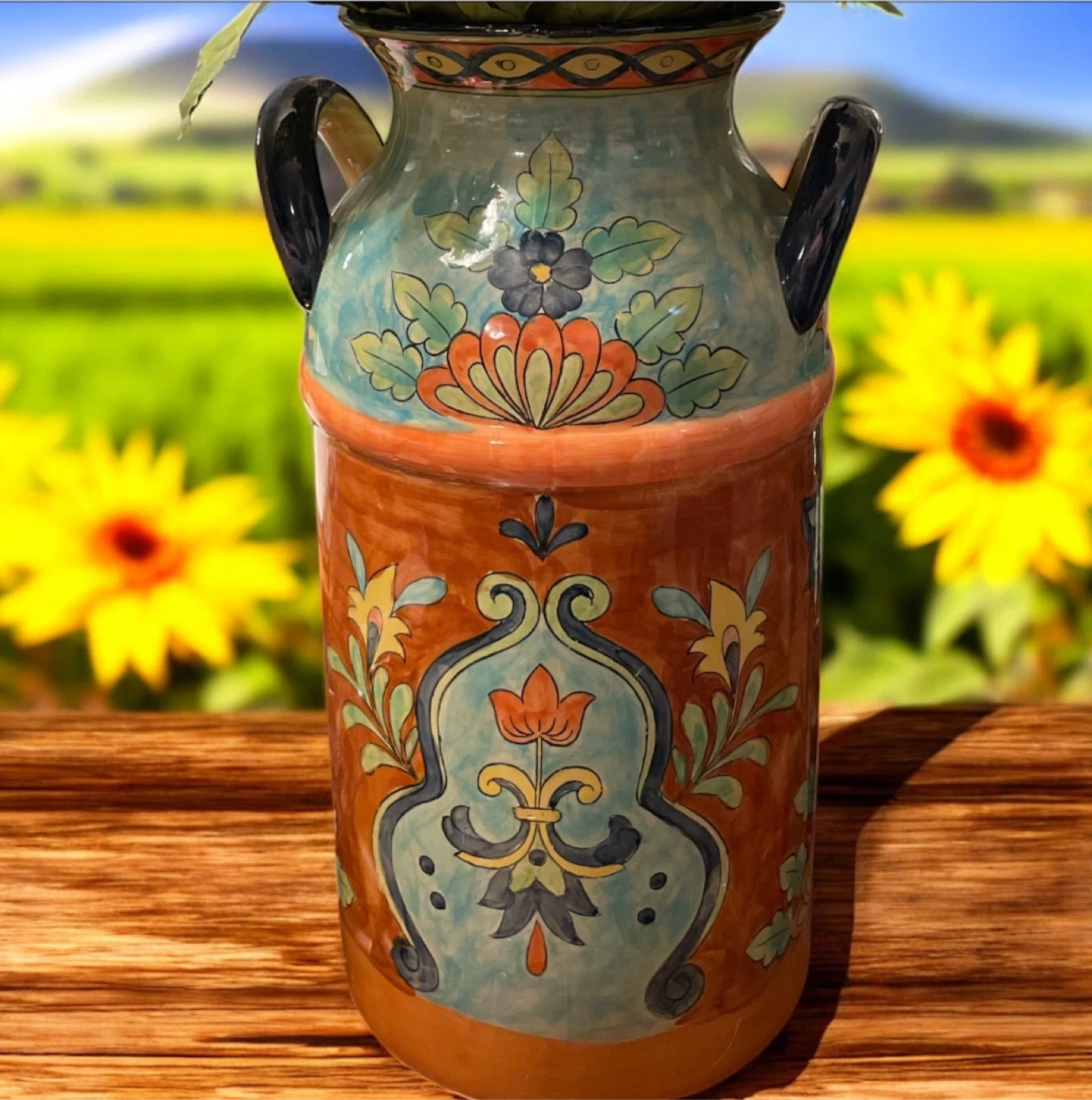 Beautiful decorative vase with a Talavera-style design! Please see pictures for details - bottom has a big chip and the sides are reinforced with glue to avoid any damage. Questions? Let me know.