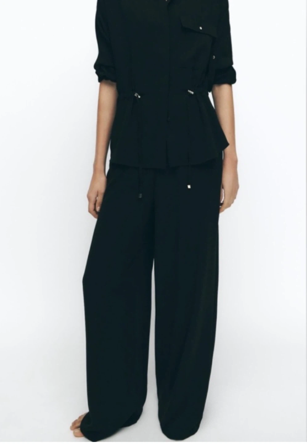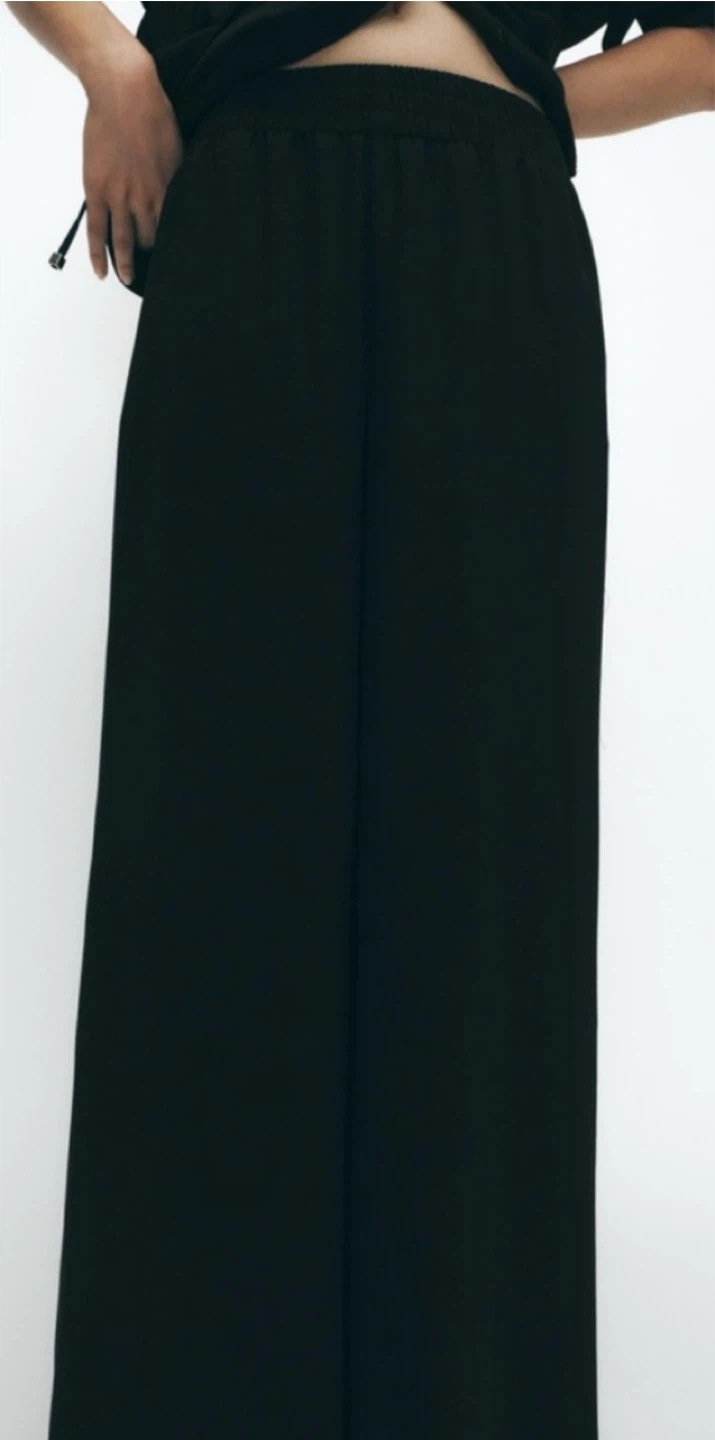 High-waist crepe trouser with elasticized back and sleek tailoring at front. Slit side pockets that don’t take away from the sleek cut of these wide-leg black trousers.