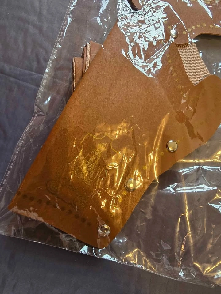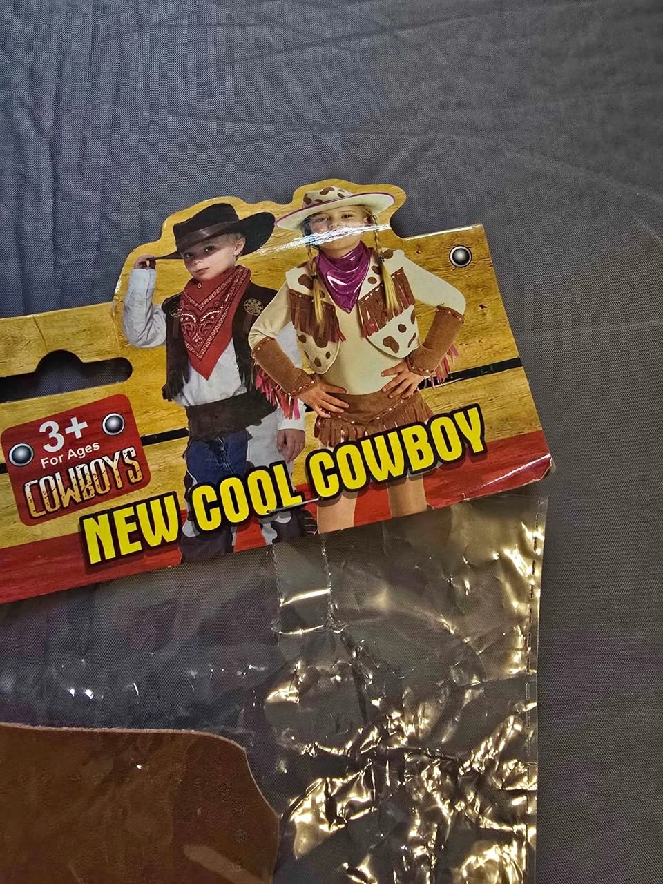 Fun Western Cowboy costume perfect for Halloween or pretend play! Comes with belt holster and accessories — lightweight and easy to wear for ages 3 and up. Still sealed in original packaging. ✨ Condition: Brand New (sealed) ✨ Age: 3+ ✨ Color: Brown with gold accents ✨ Includes: Belt holster + adjustable straps 💫 Perfect for cowboy or cowgirl Halloween looks!