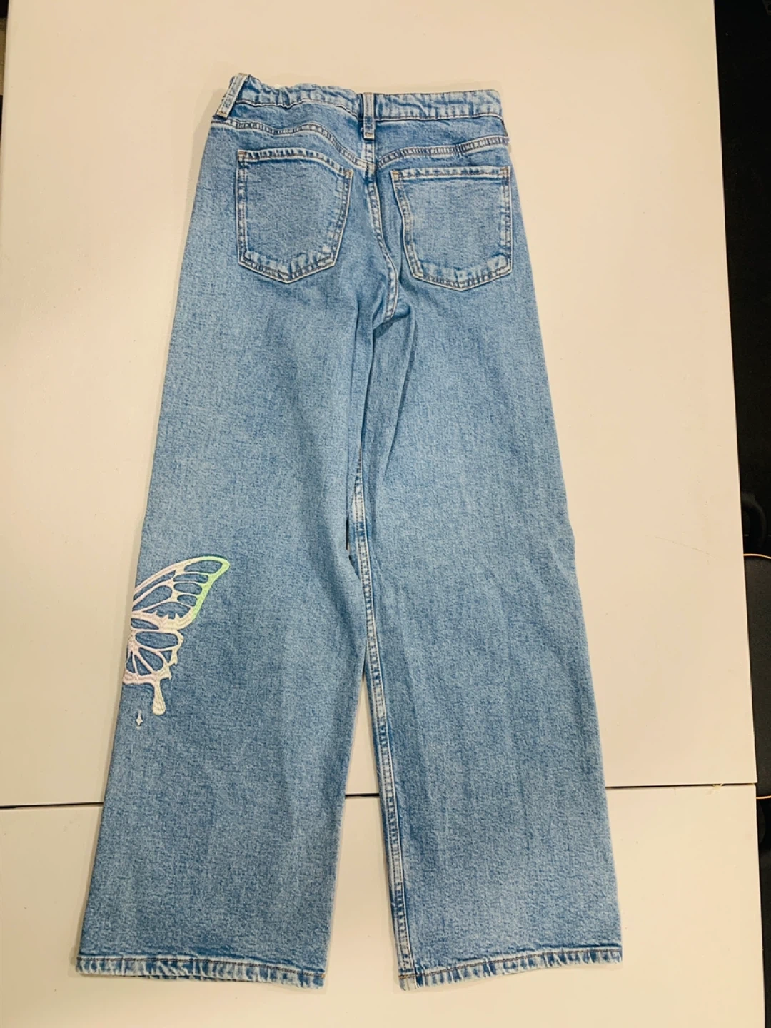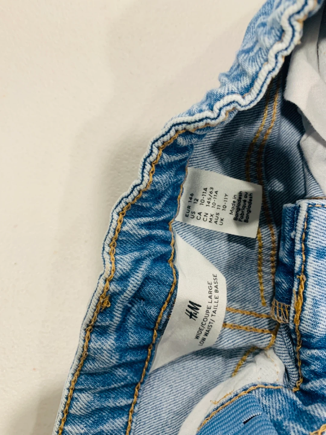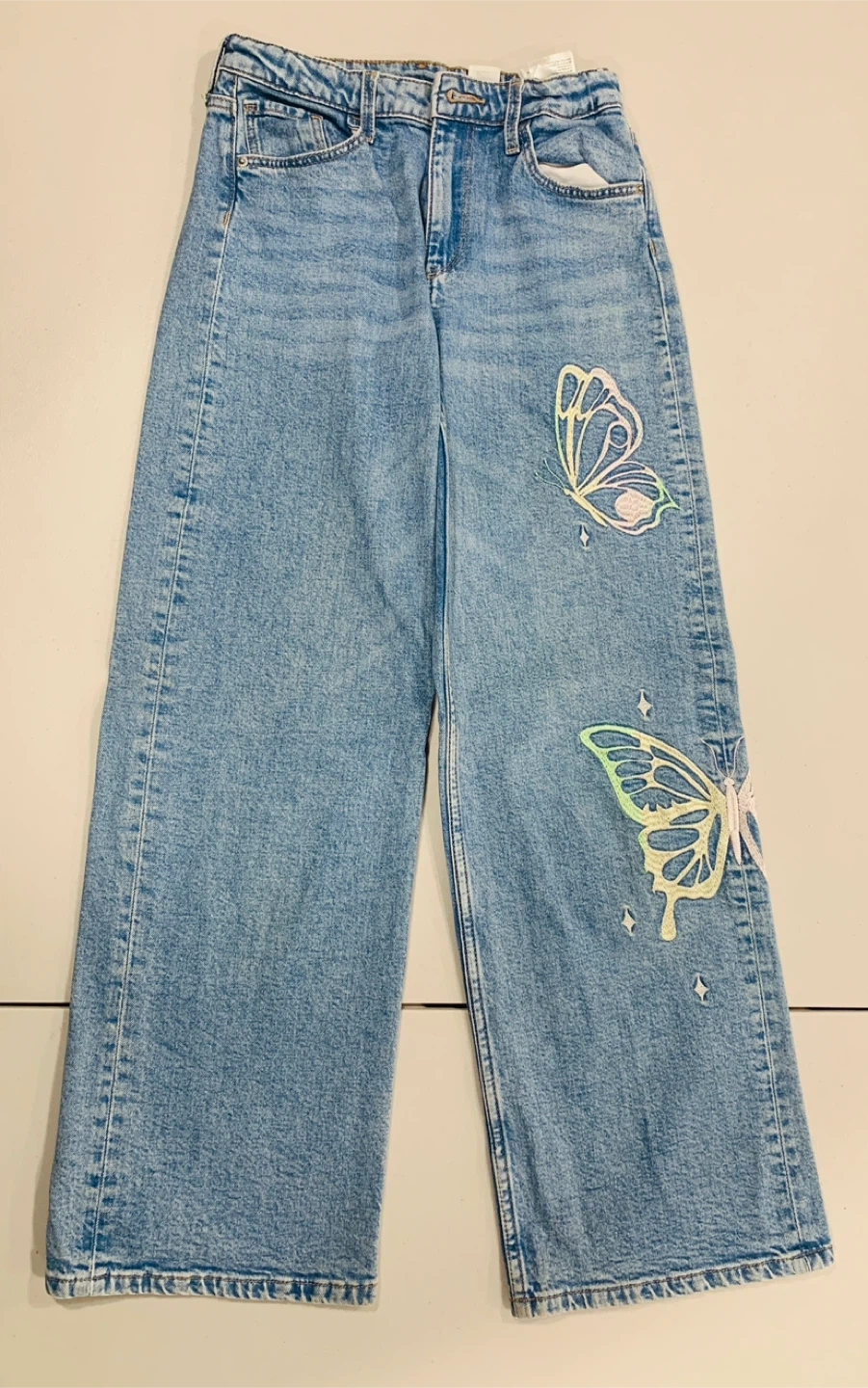 Selling a cute pair of H&M wide leg jeans! They're a size 12 (EUR 146, US 12, CA 10-11A, CN 145/63, MX 10-11A, AUS 11, UK 10-11Y). These jeans have a stylish wide coupe large (low waist/ taille basse) design and feature butterfly details on the legs