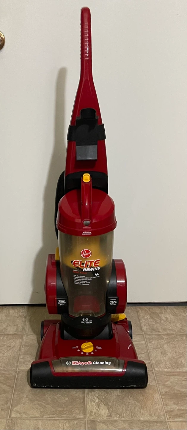 Hoover Elite Rewind Widepath vacuum cleaner in red, yellow, and black. It features automatic cord rewind, making storage a breeze! The vacuum uses a lifetime HEPA filter, perfect for allergy sufferers. It is designed for widepath cleaning and has 12 amps of power for strong suction. It's in excellent condition. From smoke-free, pest-free, and pet-free home.