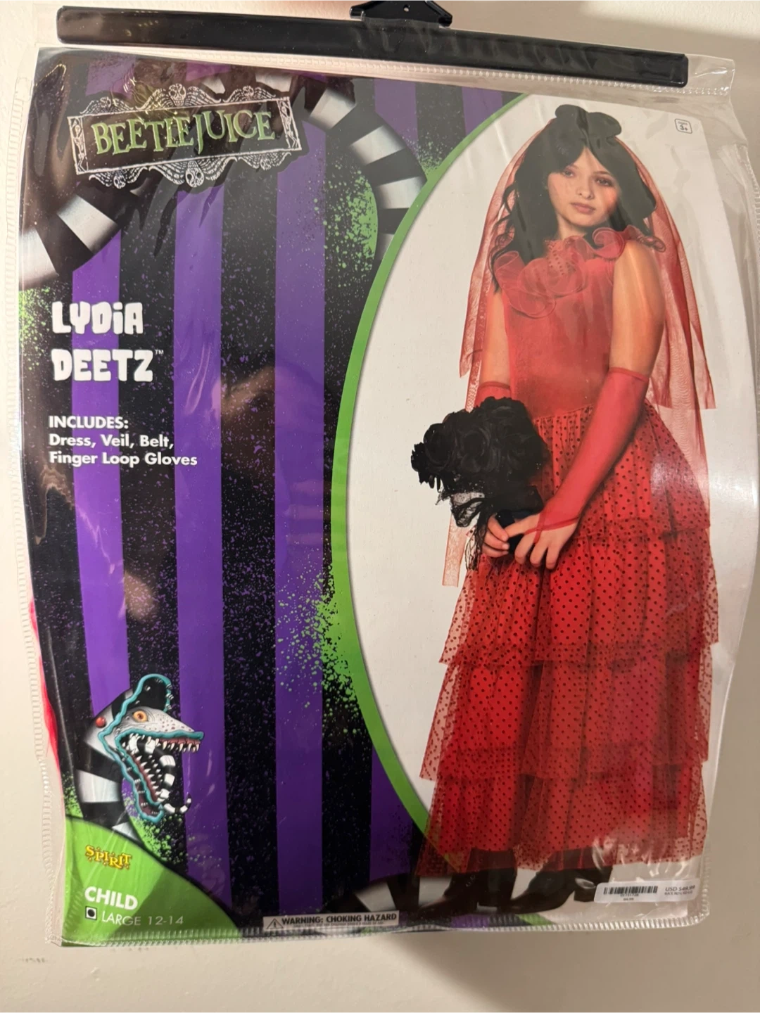 *BRAND NEW, in-package Beetlejuice Lydia Deetz costume for kids! This is a child's size large, fitting sizes 12-14. The costume includes the dress, veil, belt, and finger loop gloves. Perfect for Halloween or dress-up!