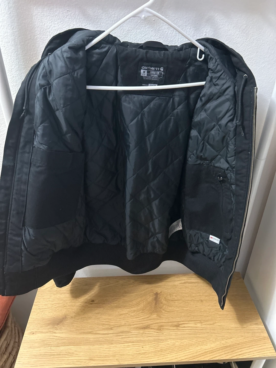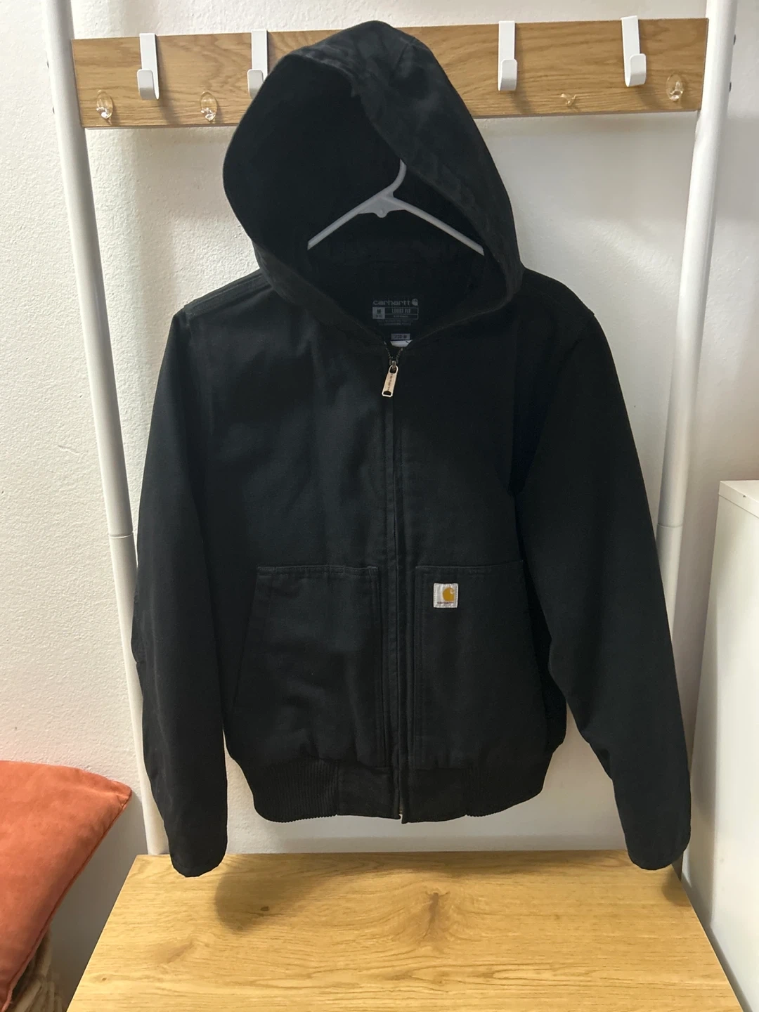 Selling a Carhartt loose fit jacket in black. It's a size medium and has a hood. Perfect for layering or wearing on its own!