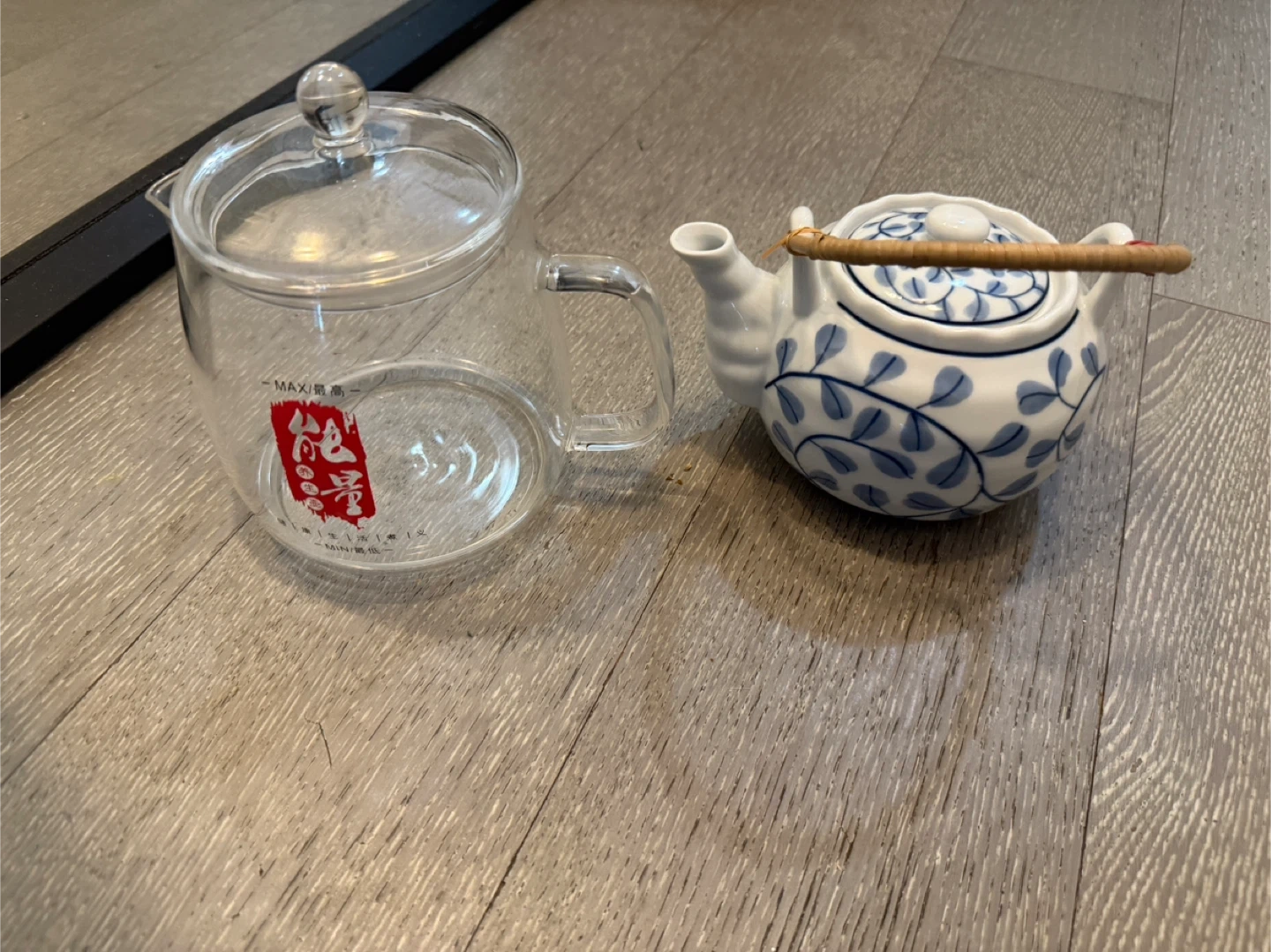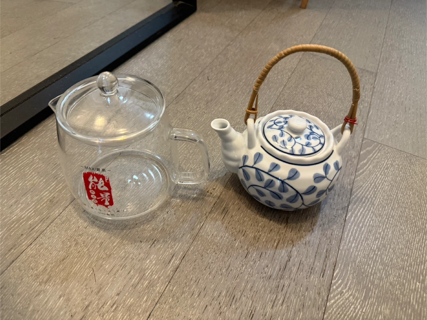 1000+Selling a cute teapot set! One is a clear glass teapot from MAXI and the other is a white ceramic teapot with a lovely blue floral design. Perfect for tea lovers!