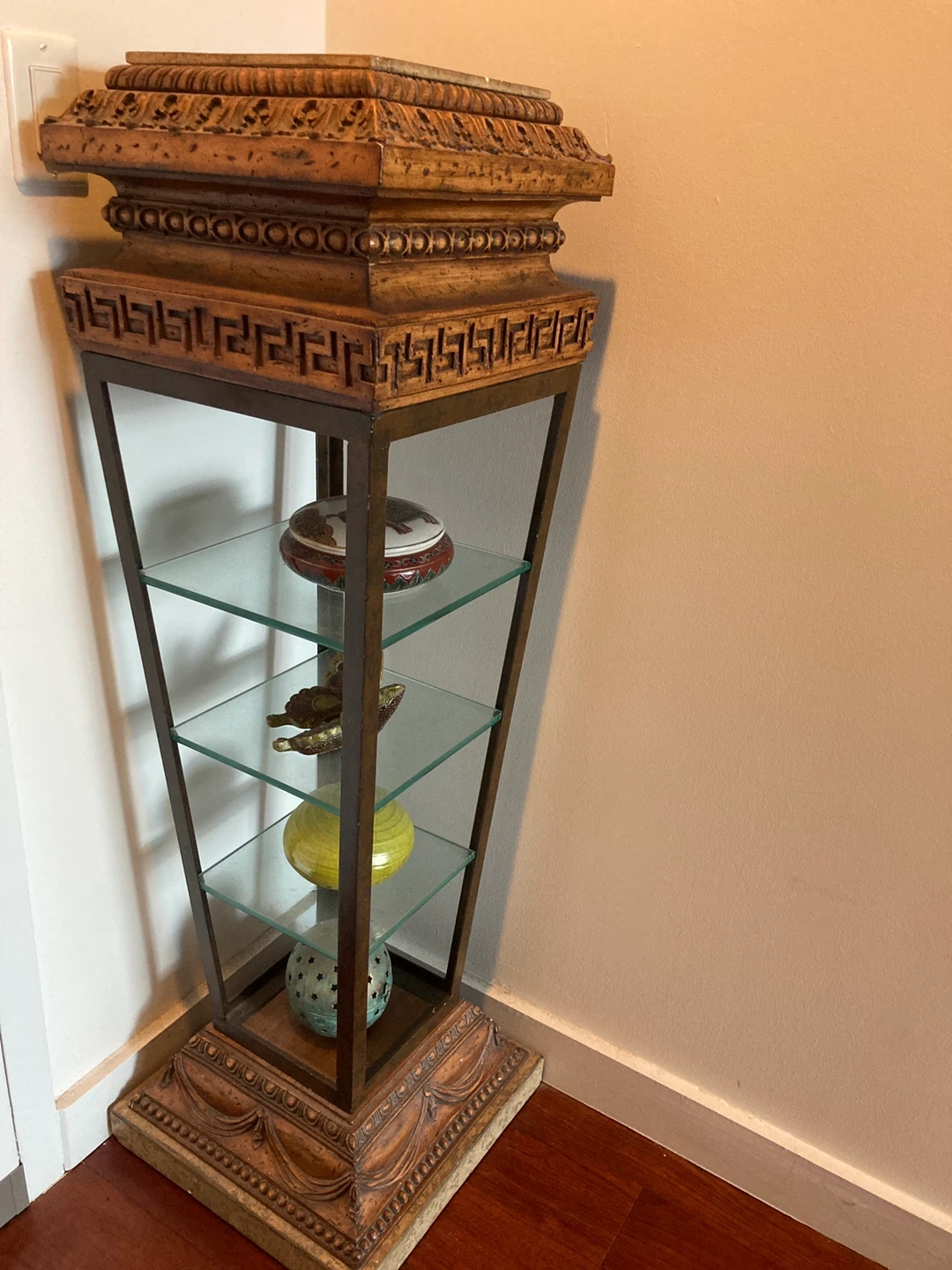 This is a decorative display stand with a unique design. It features a sturdy frame with glass shelves, perfect for showcasing your favorite items. The stand has an ornate top and base, adding a touch of elegance to any room. It's in great condition and ready to enhance your home decor