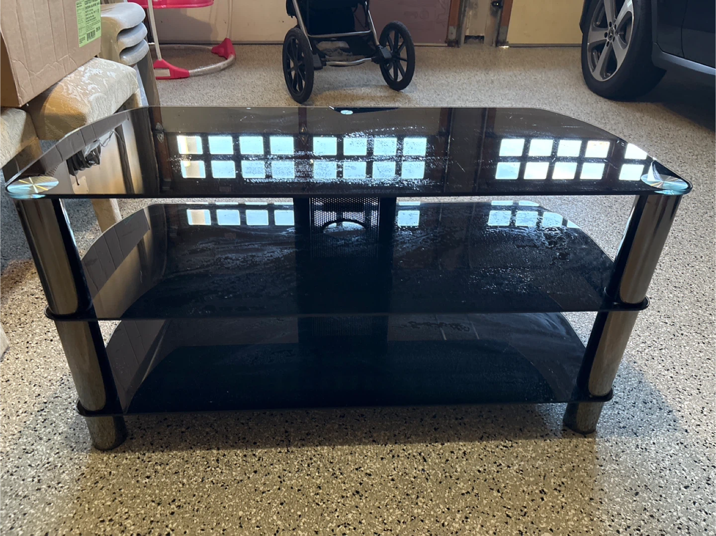 Selling a black glass TV stand. It has a sleek design and two shelves for storage. Perfect for your living room setup