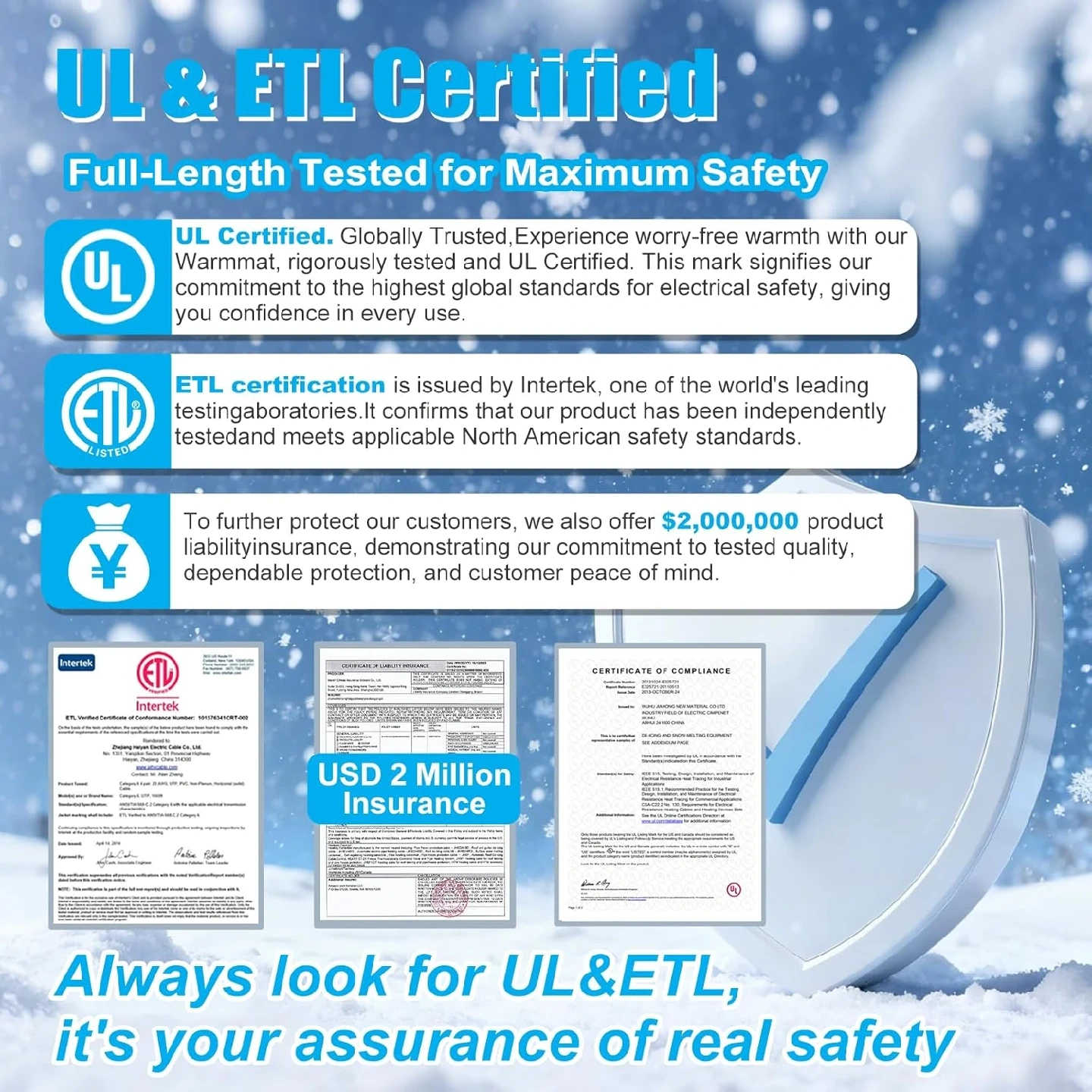 【ETL & UL Certified for Superior Safety】Our self-regulating heating cable is fully ETL and UL certified, ensuring compliance with the highest safety standards across North America. Unlike products with only partial certification (e.g., a UL-certified plug but uncertified cable), our cable undergoes comprehensive testing for complete safety assurance, delivering exceptional performance and reliability