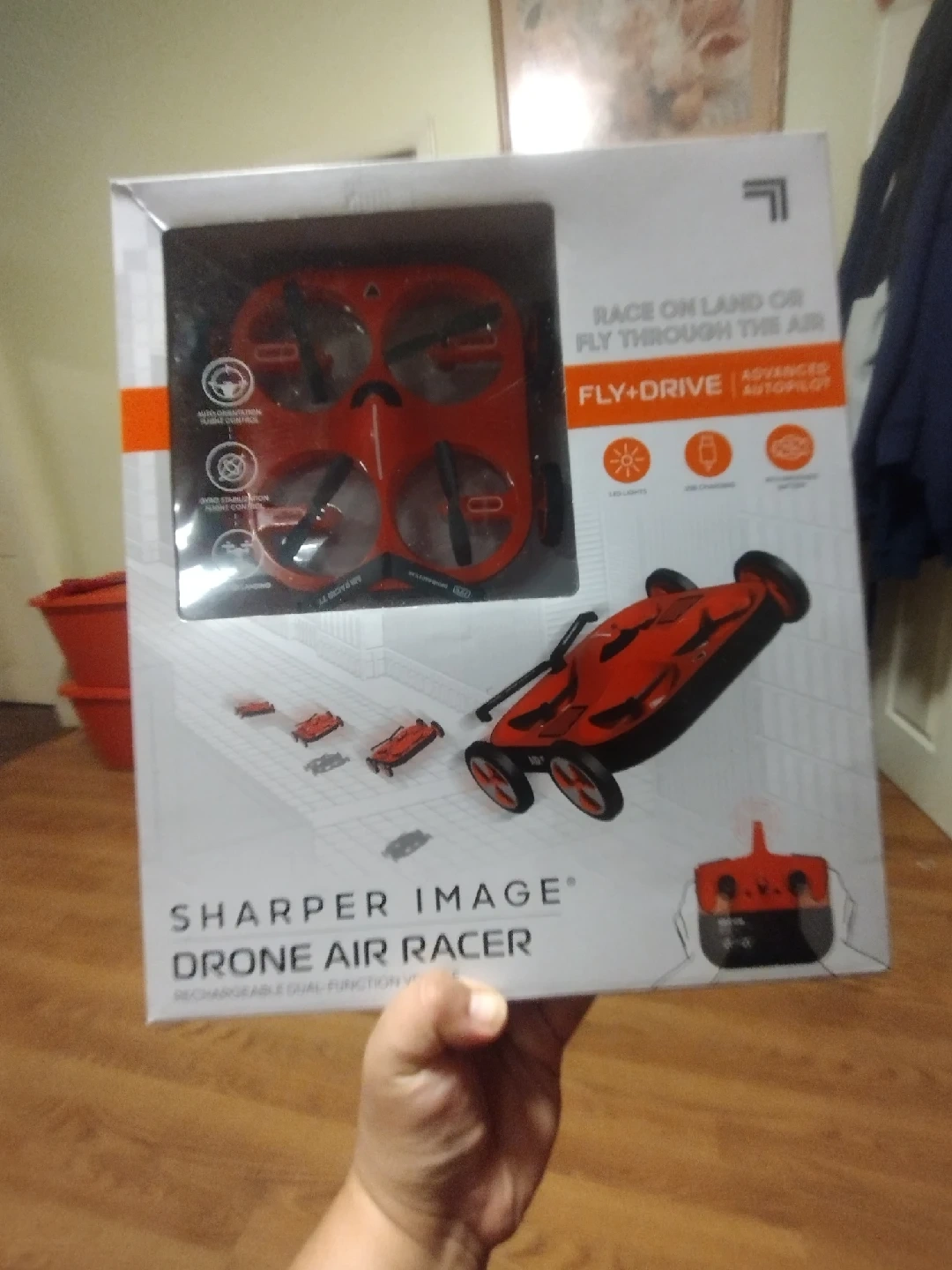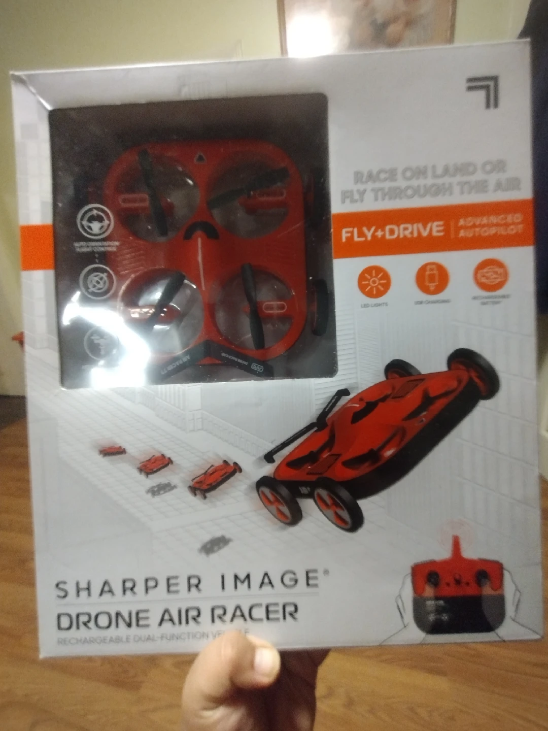 Selling a brand new Sharper Image Drone Air Racer still in its original packaging! This rechargeable, dual-function vehicle can race on land or fly through the air. It features advanced autopilot and LED lights for enhanced visibility. Get ready for some fun!