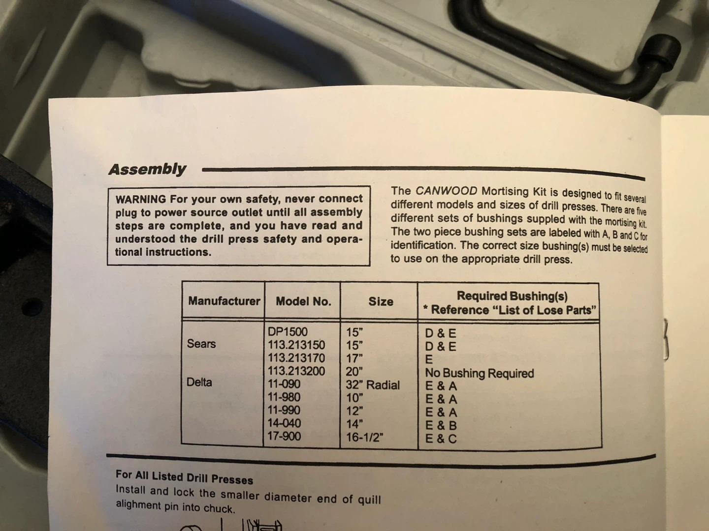 Fits most standard drill presses. Has two complete bushing sets. Instructions include how to set up for Delta Drill Presses.