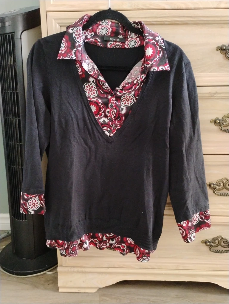 Here's a Style & Co. black sweater with a cute floral trim! It's in great condition and ready for a new home. The sweater features a V-neck and long sleeves, perfect for layering or wearing on its own. The floral trim adds a touch of elegance and style to this classic piece