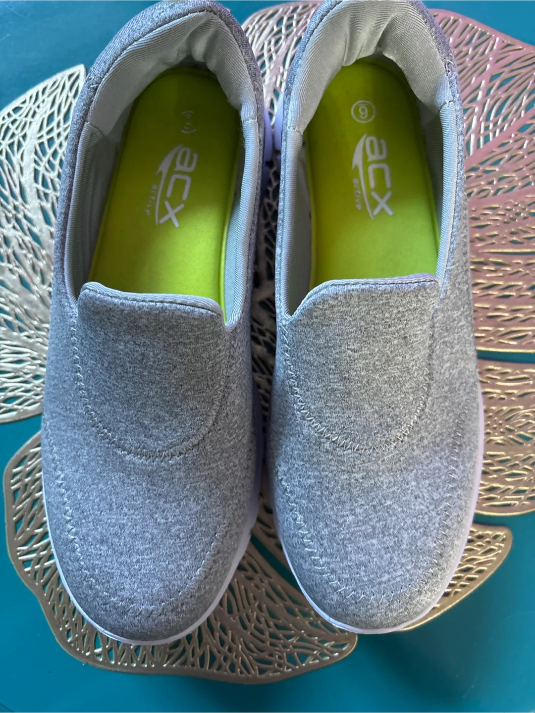 Selling a pair of ACX Active slip-on shoes in grey! They're super comfy and easy to wear, perfect for everyday activities. The size is a women's 6.
