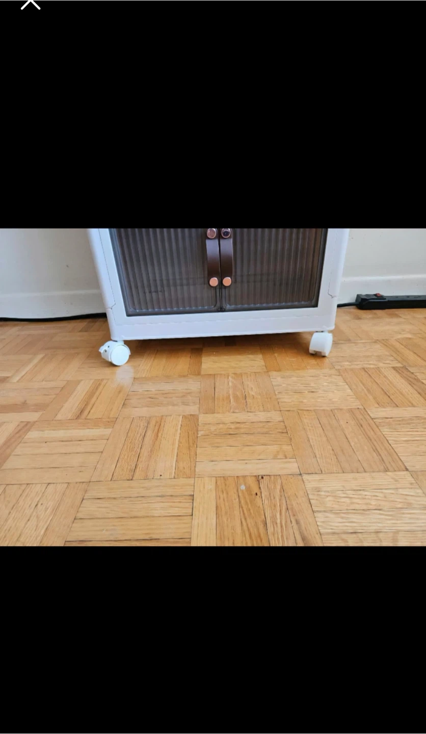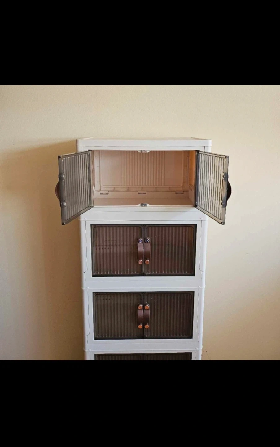 Looking to declutter? I'm selling these stackable storage cabinets! They're in great shape and perfect for organizing your space. The cabinets have a white frame with a brown-tinted door.