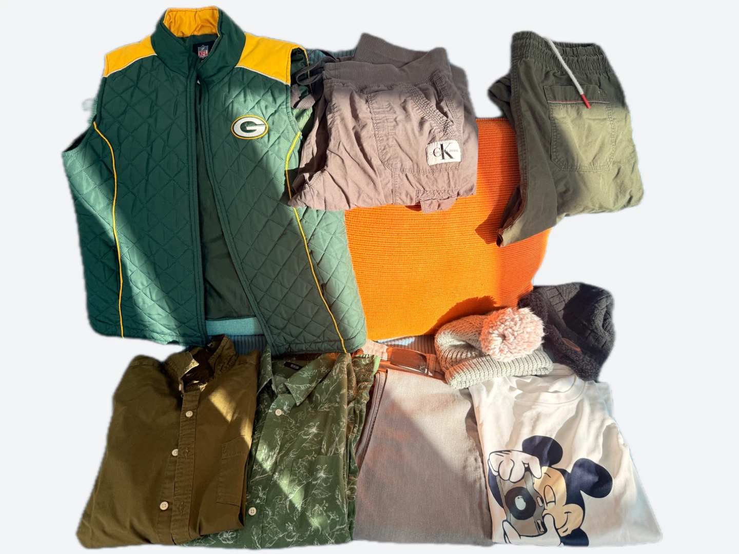 A collection of mixed clothing items, including a Green Bay Packers vest, Calvin Klein and tommy cargo, and a Mickey Mouse T-shirt and aeropostale shirt.