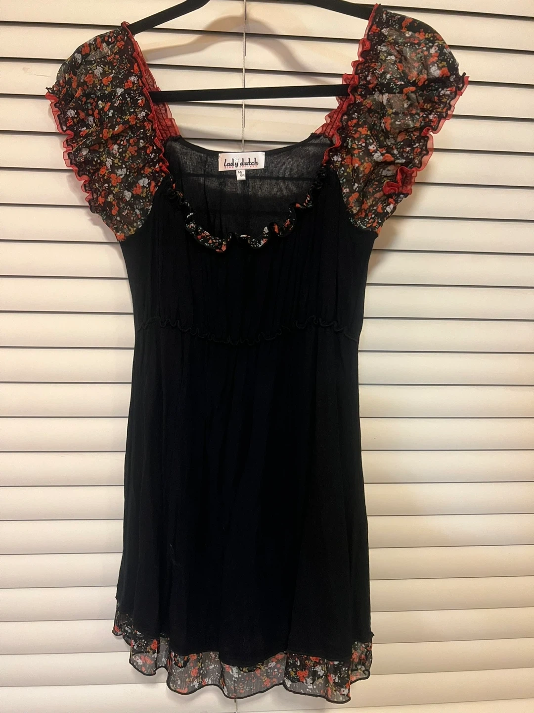 Cute Lady Dutch top with a black body and floral detailing on the sleeves and hem! Size is M.