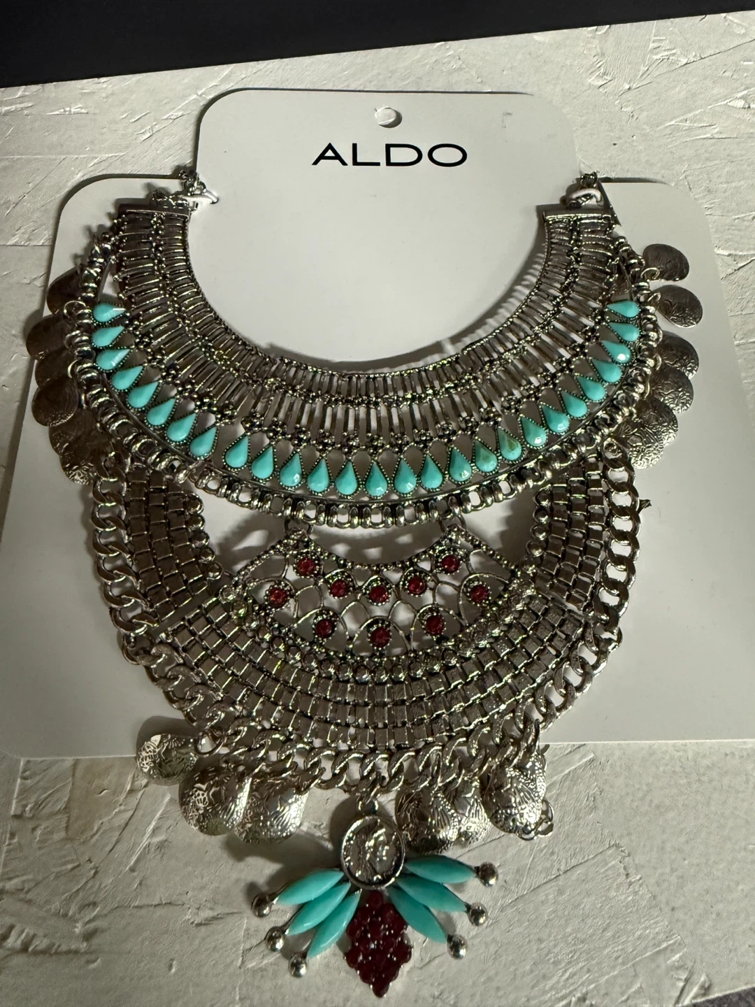 Gorgeous Aldo statement necklace featuring silver metal with turquoise and red accents. Perfect for adding a touch of boho chic to any outfit!