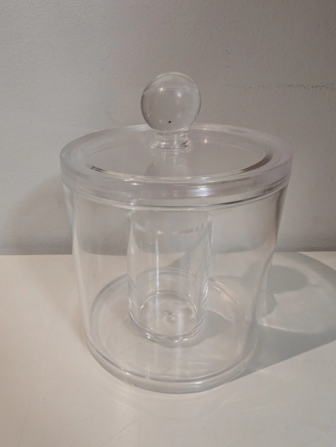 A clear acrylic (plastic) container perfect for storing cotton balls and q-tips! It's in great condition and would look lovely in any bathroom, for easy access.