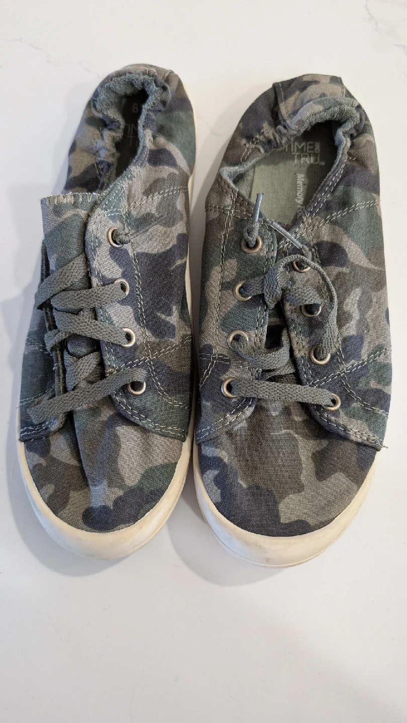 Selling a pair of Time and Tru camo sneakers in a women's size 8. They have a memory foam insole for extra comfort!