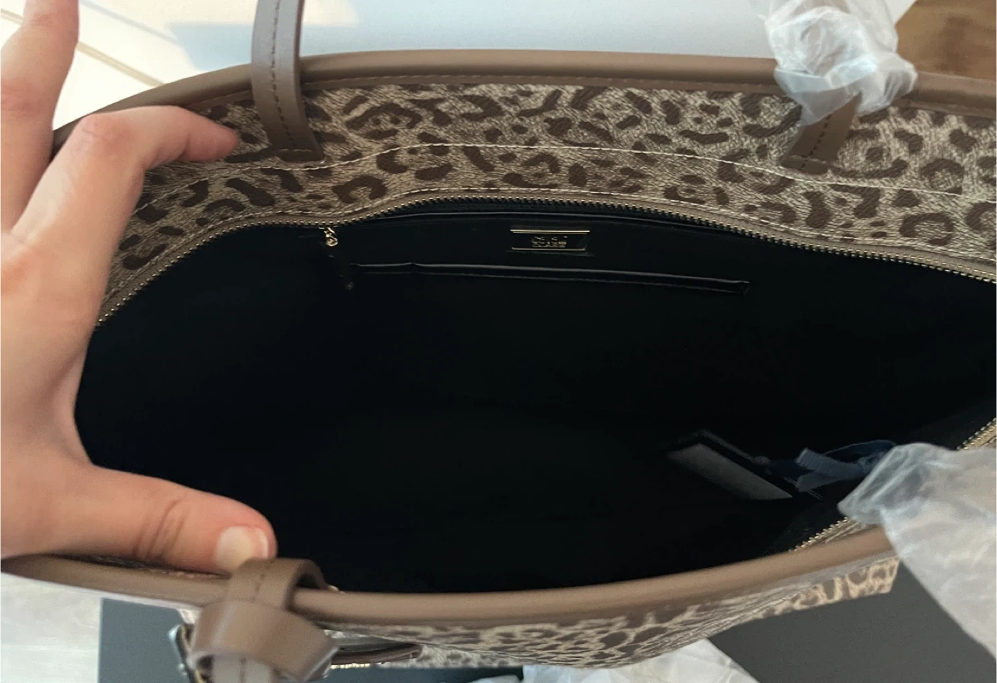 New with tag and dust bag, still in plastic. Minor scuff as shown but otherwise in perfect condition. This stunning ‘shopper' tote is a travel essential for your handbag collection. It's sized to organize a laptop, notebook, cosmetic case and other daily musts and accented with a detachable luggage tag. Stylish leopard print tote bag perfect for any occasion. Features a chic brown and tan design. Ideal for adding a touch of elegance to your outfit. Originally $255 USD ($375 CAD).