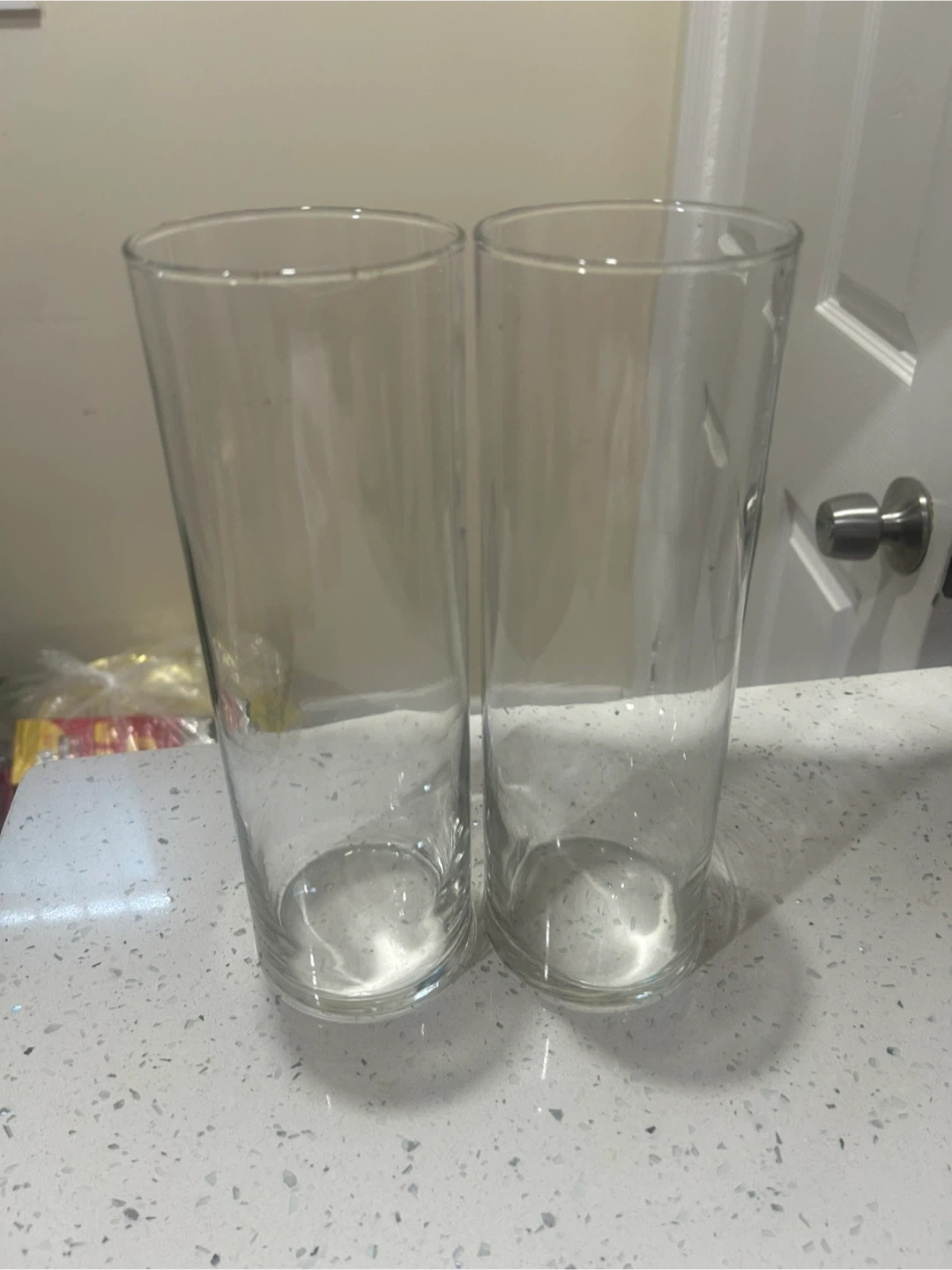 Selling tall, clear glass vases. They're about 4 inches in diameter and stand approximately 10 inches tall. Perfect for displaying flowers or adding a touch of elegance to your home decor! Have about 20