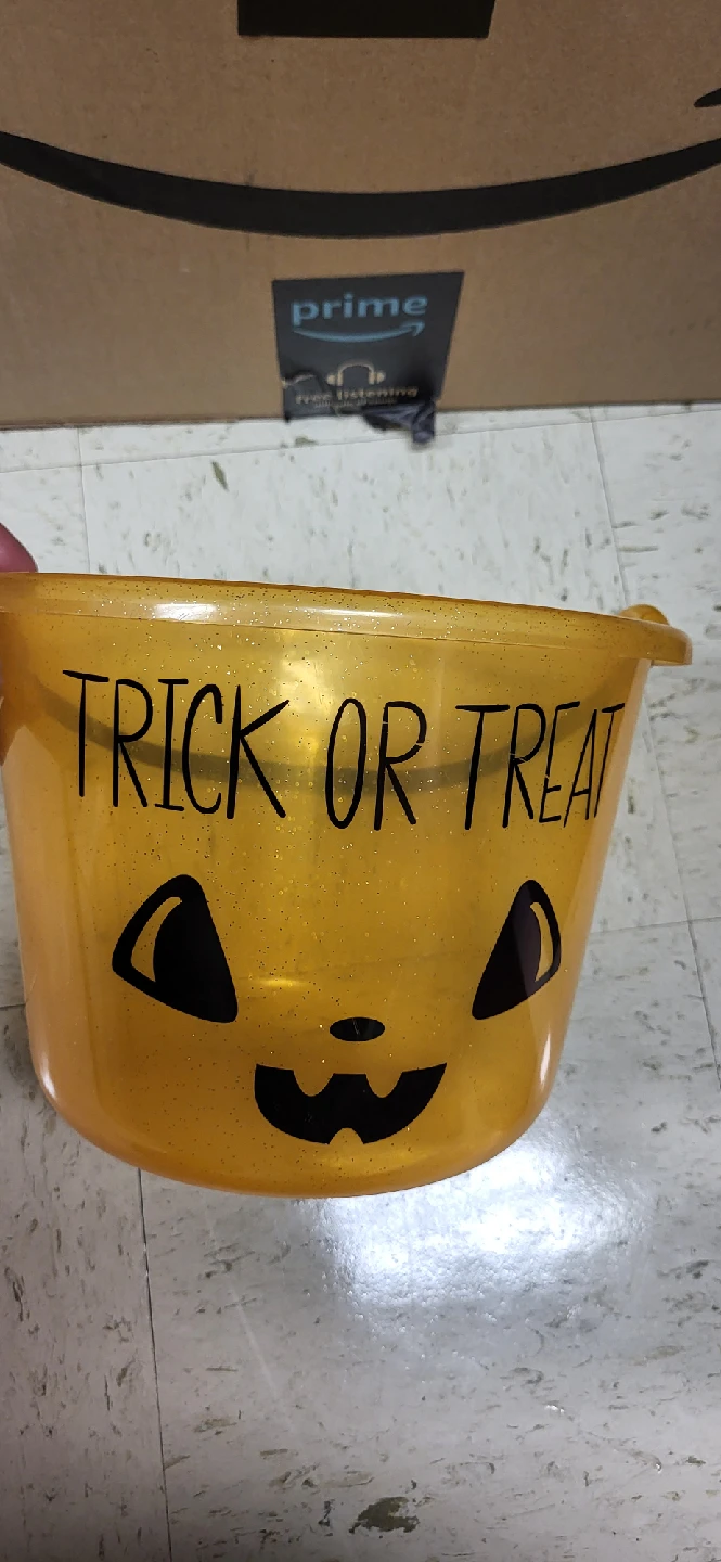 Get ready for Halloween with this fun trick or treat bucket! It features a cute Jack O' Lantern face and the words "Trick or Treat". Perfect for collecting candy on Halloween night