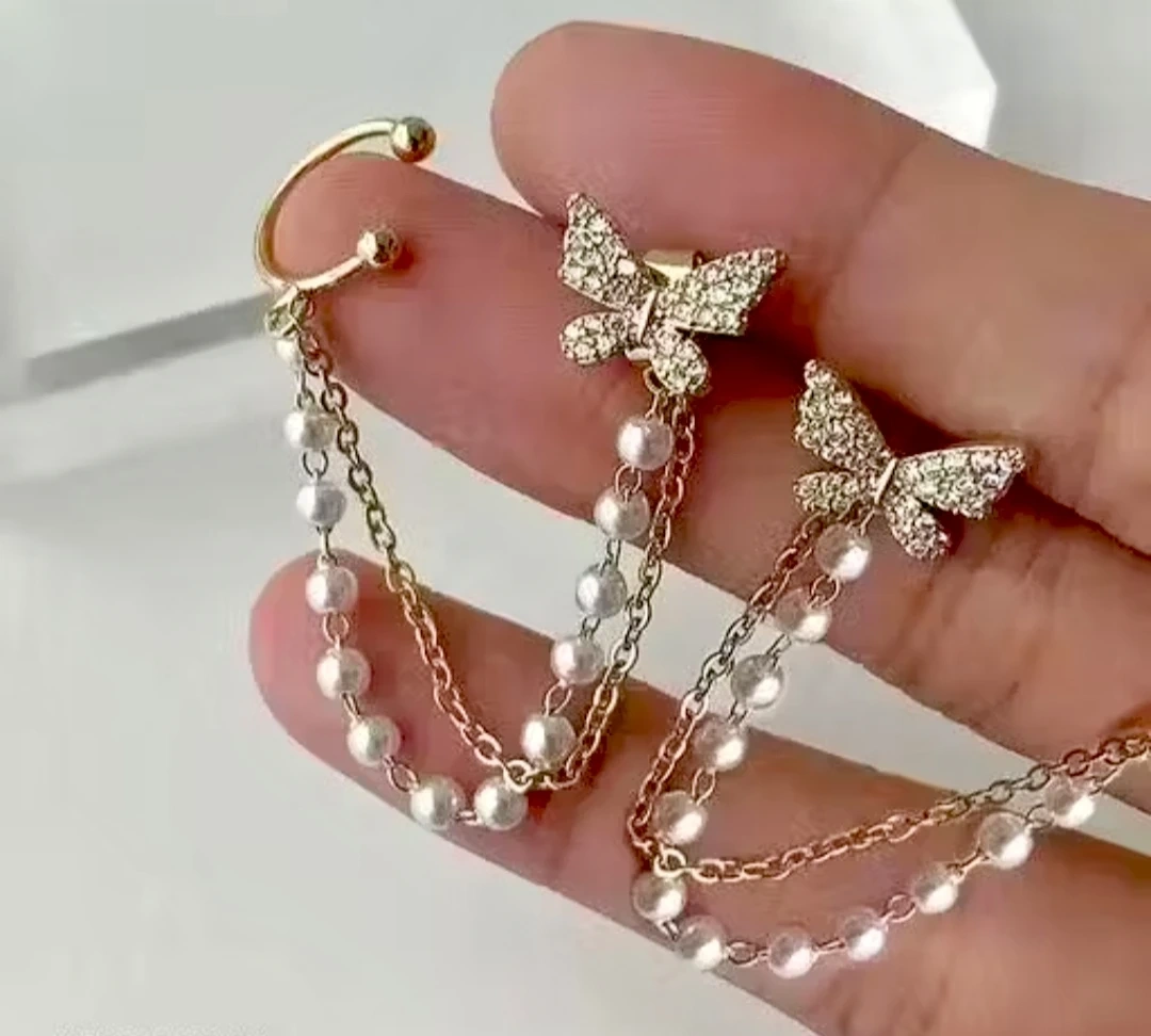 These are a pair of butterfly dangle ear cuff earrings. They feature a butterfly design with pearl chains. Perfect for adding a touch of elegance to any outfit!
