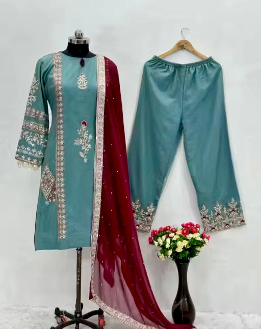 This is a beautiful salwar kameez suit. It features intricate embroidery and a lovely colour combination. It's perfect for special occasions or everyday wear! Perfect for party wear