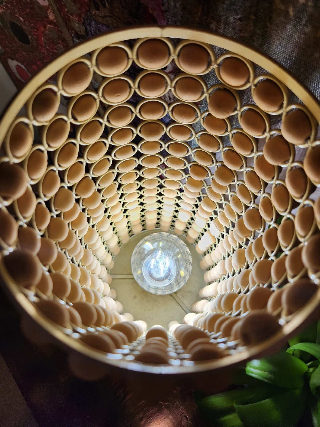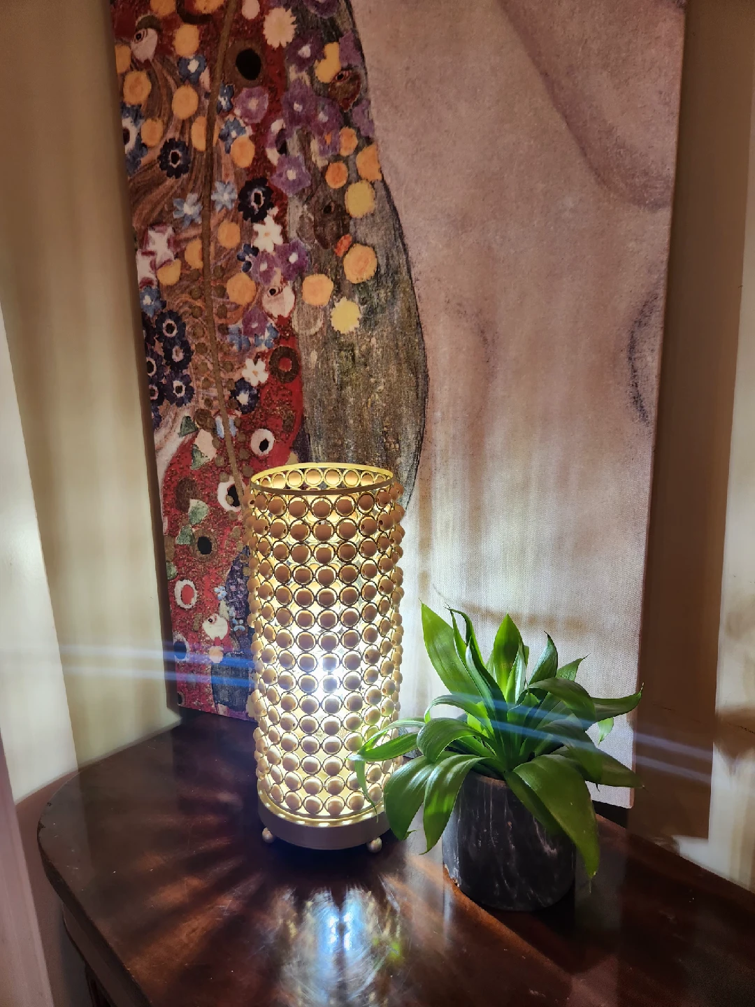 This NEW is an adorable a wood beaded accent lamp, with gold hardware. It looks great in any room! And gives off a warm, moody glow. Perfect for bedside, end tables or anyplace that needs artsy boho lighting. A great small space friendly choice! 15 inches high.