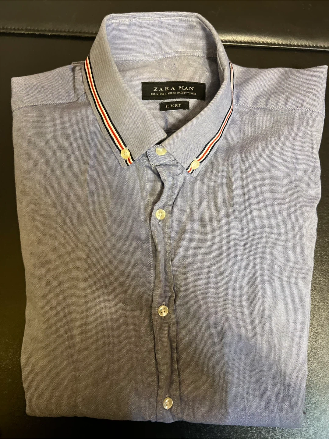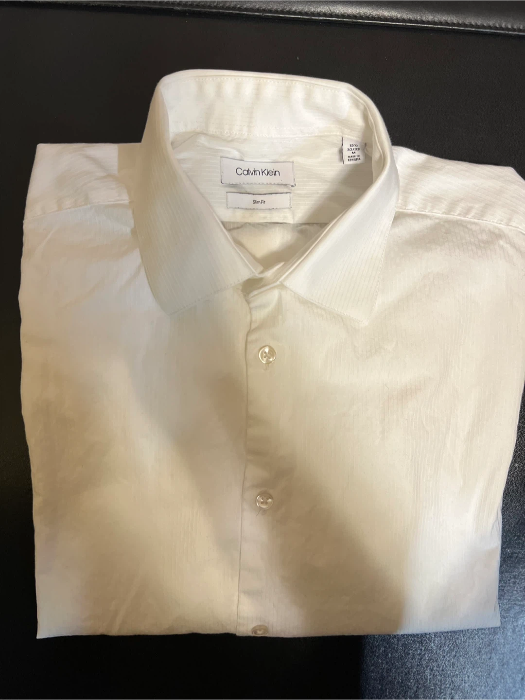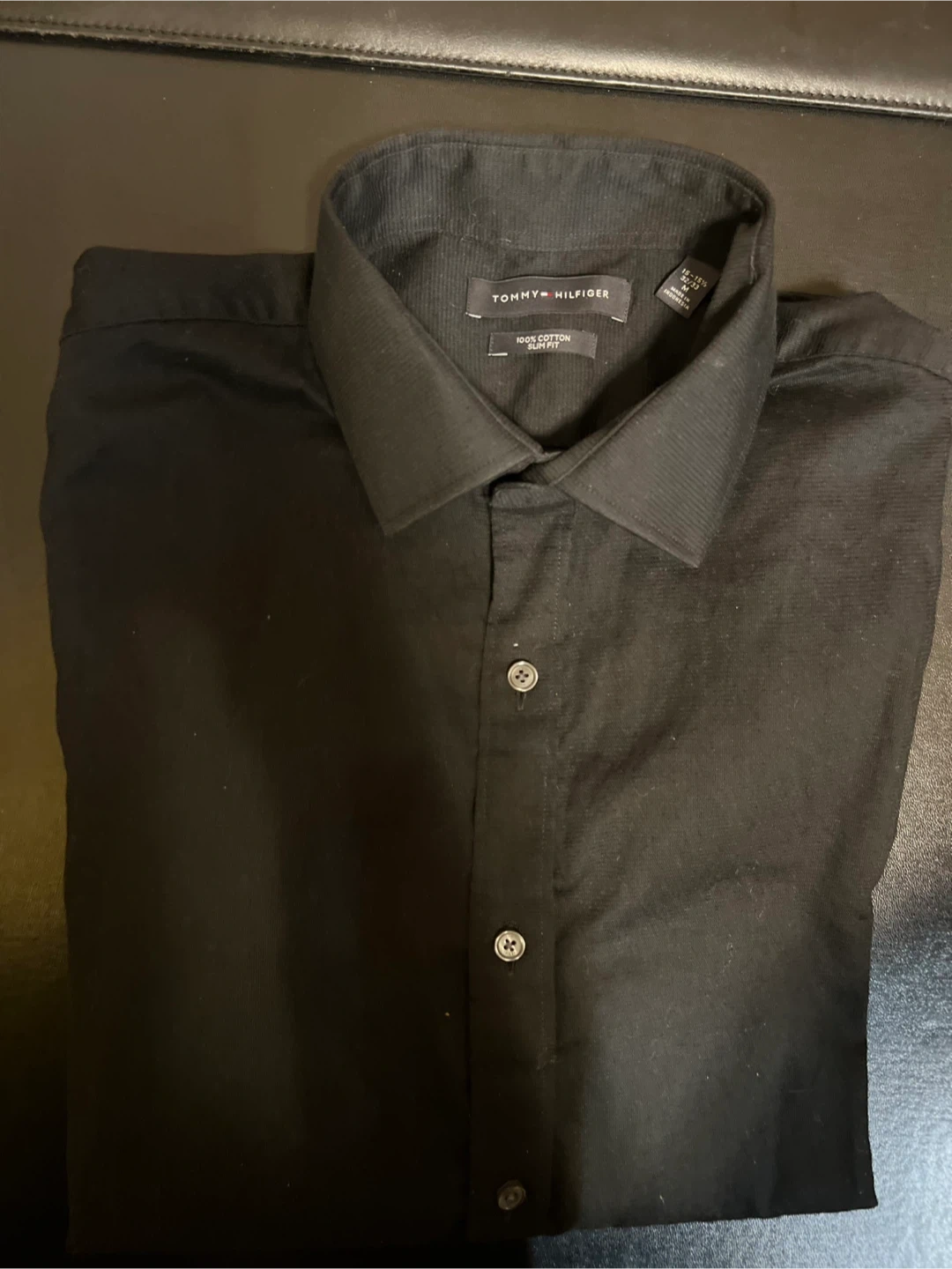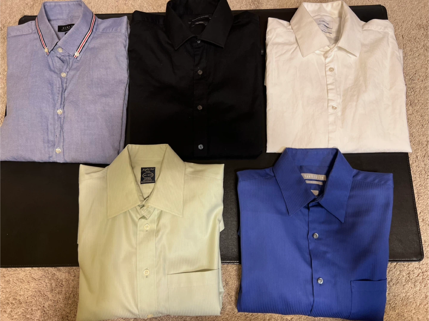 Selling a set of men's dress shirts in various colors and sizes. Includes brands like Tommy Hilfiger (black, slim fit, 16-16 1/2), Zara Man (blue, slim fit, EUR M), Joseph A. Bank (light green, 14 1/2 32/33), Calvin Klein (white, slim fit, 15 1/2 32/33), and Van Heusen (blue). All shirts are in good condition and ready for a new home!
