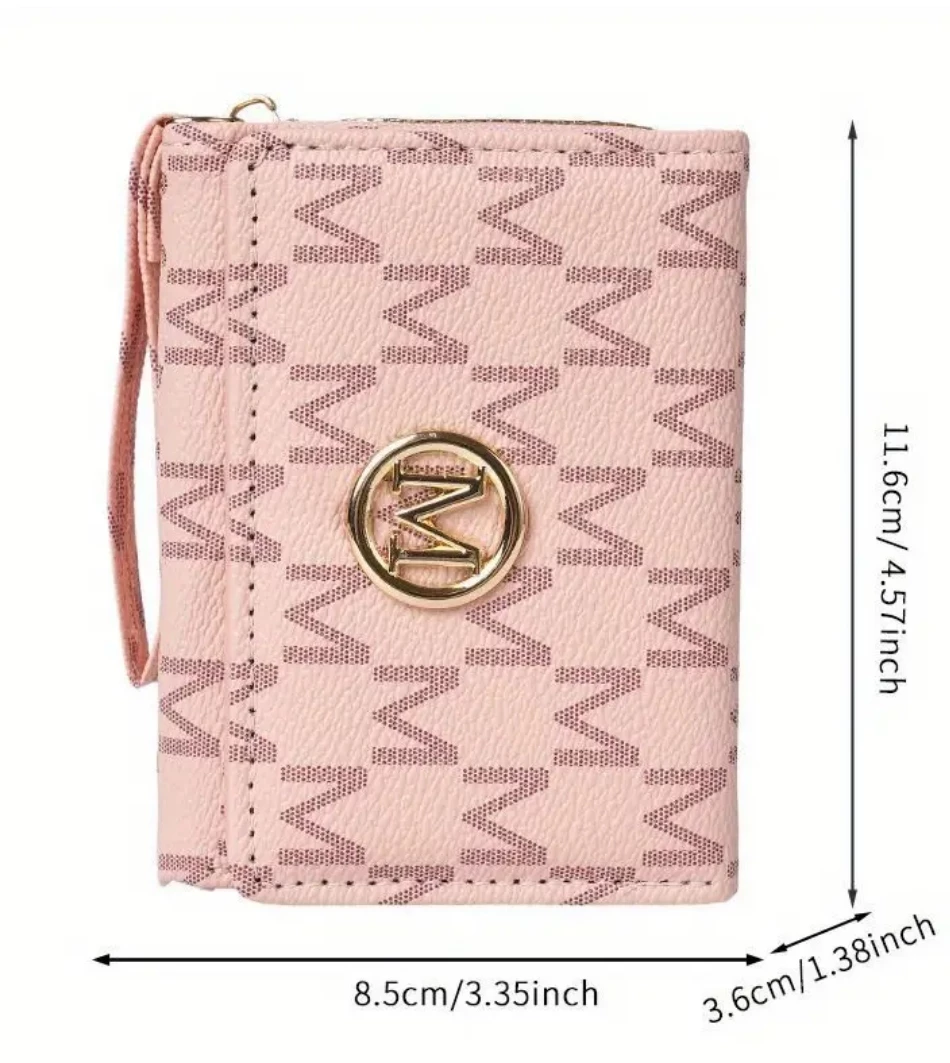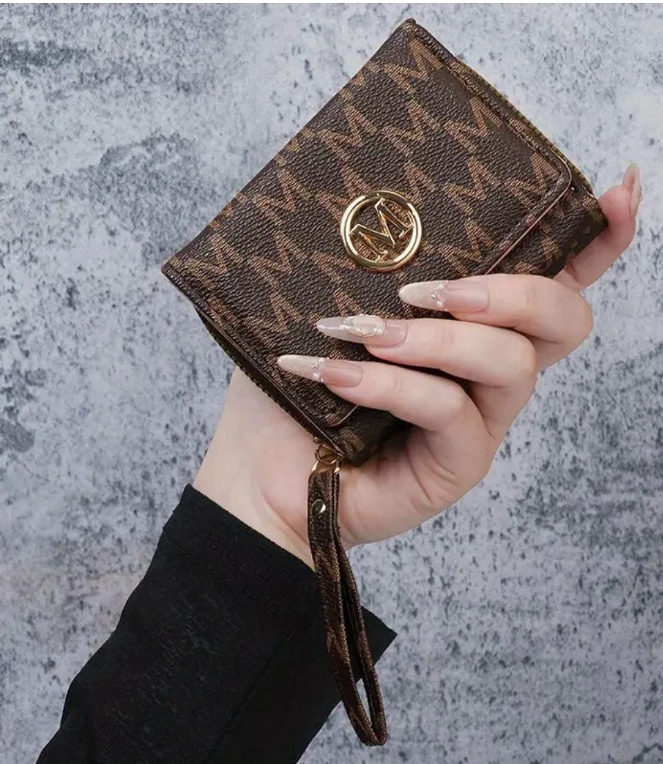Check out this stylish trifold wallet! It features a unique patterned design and a convenient wrist strap. Perfect for keeping your essentials organized and looking chic.