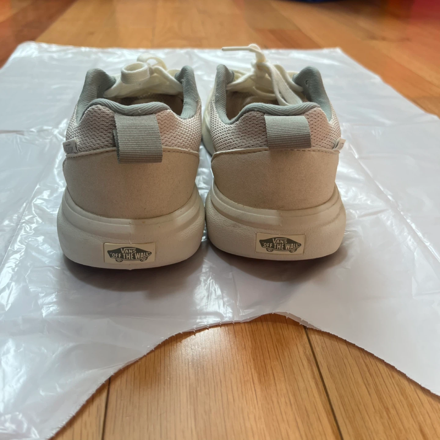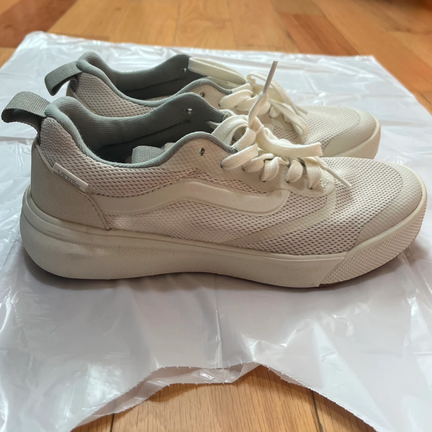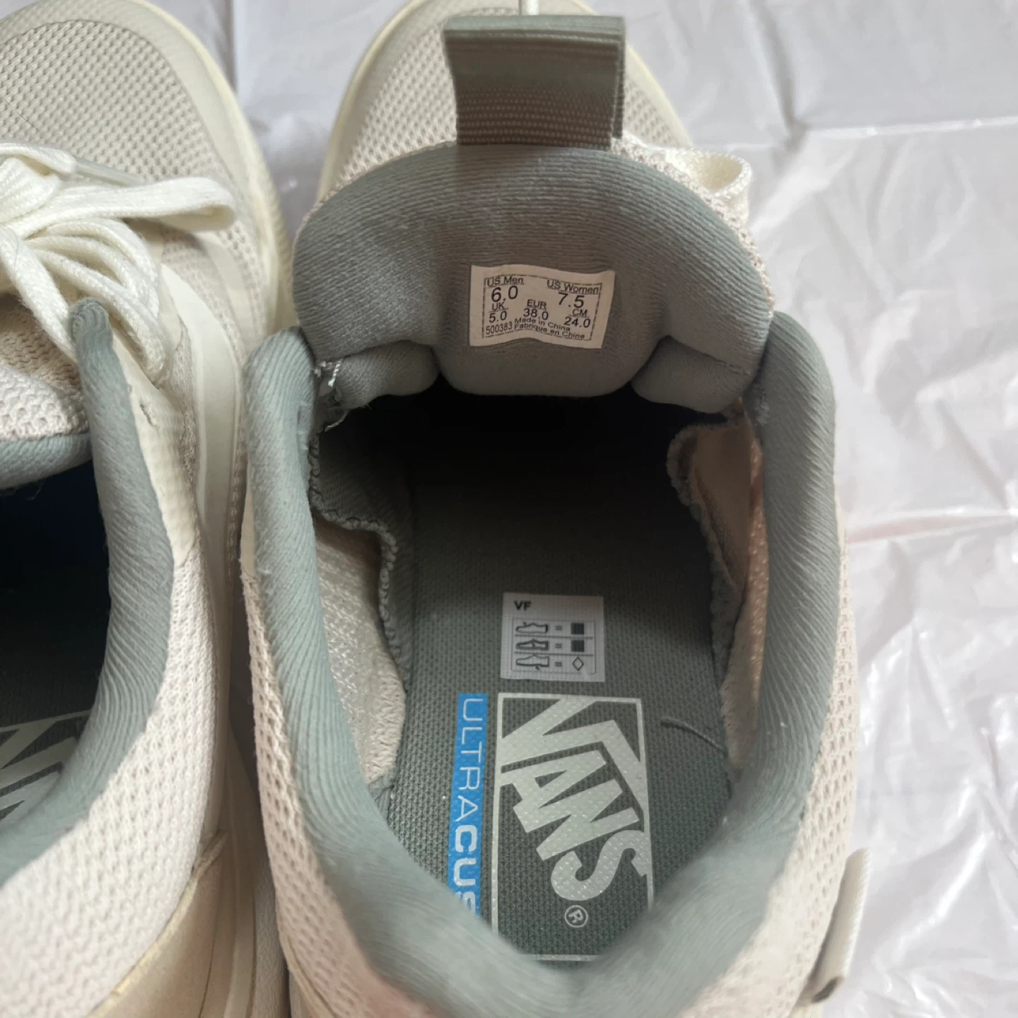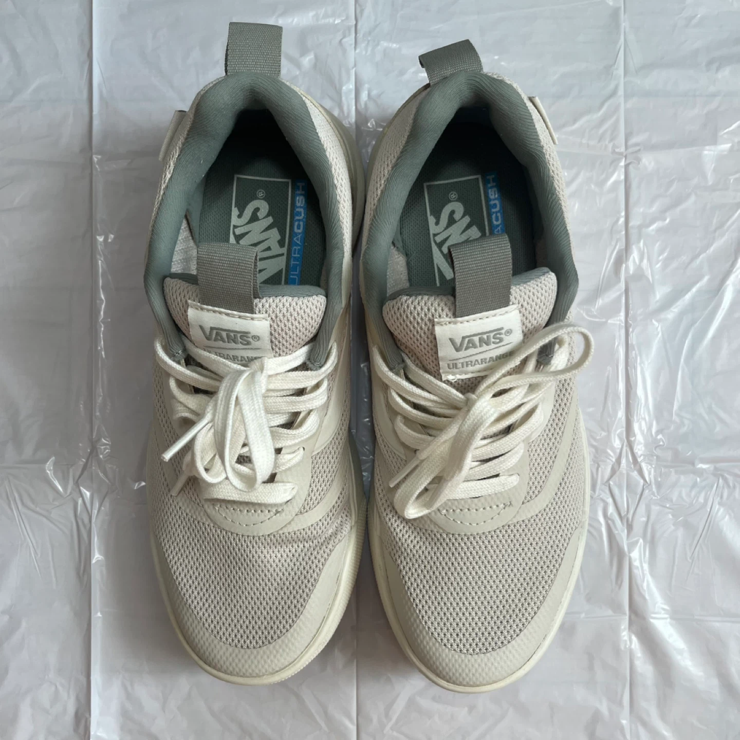 Vans sneakers with off-white and jade green mesh design. Ideal for everyday style and comfort. Ultra range and ultra cush.