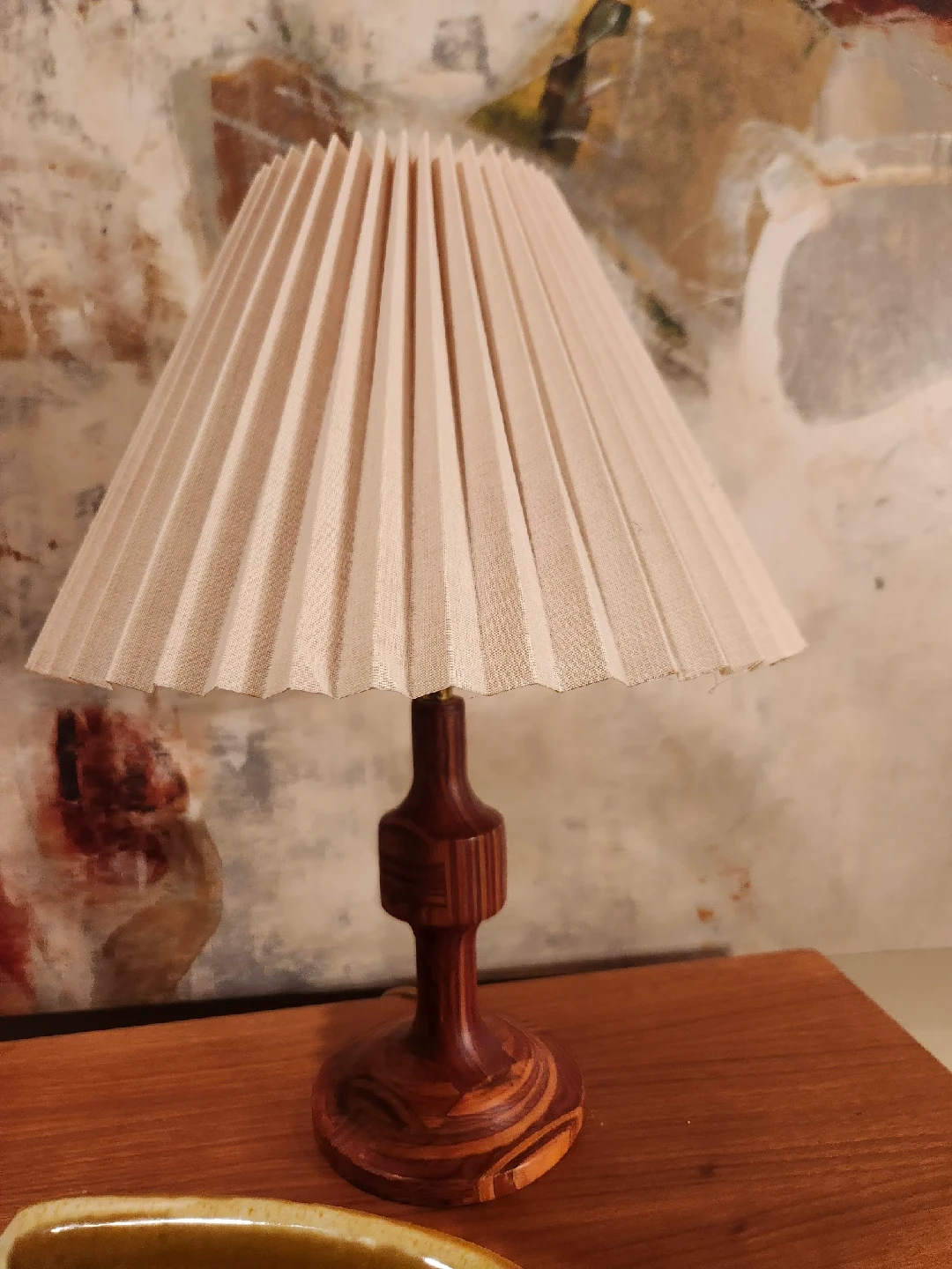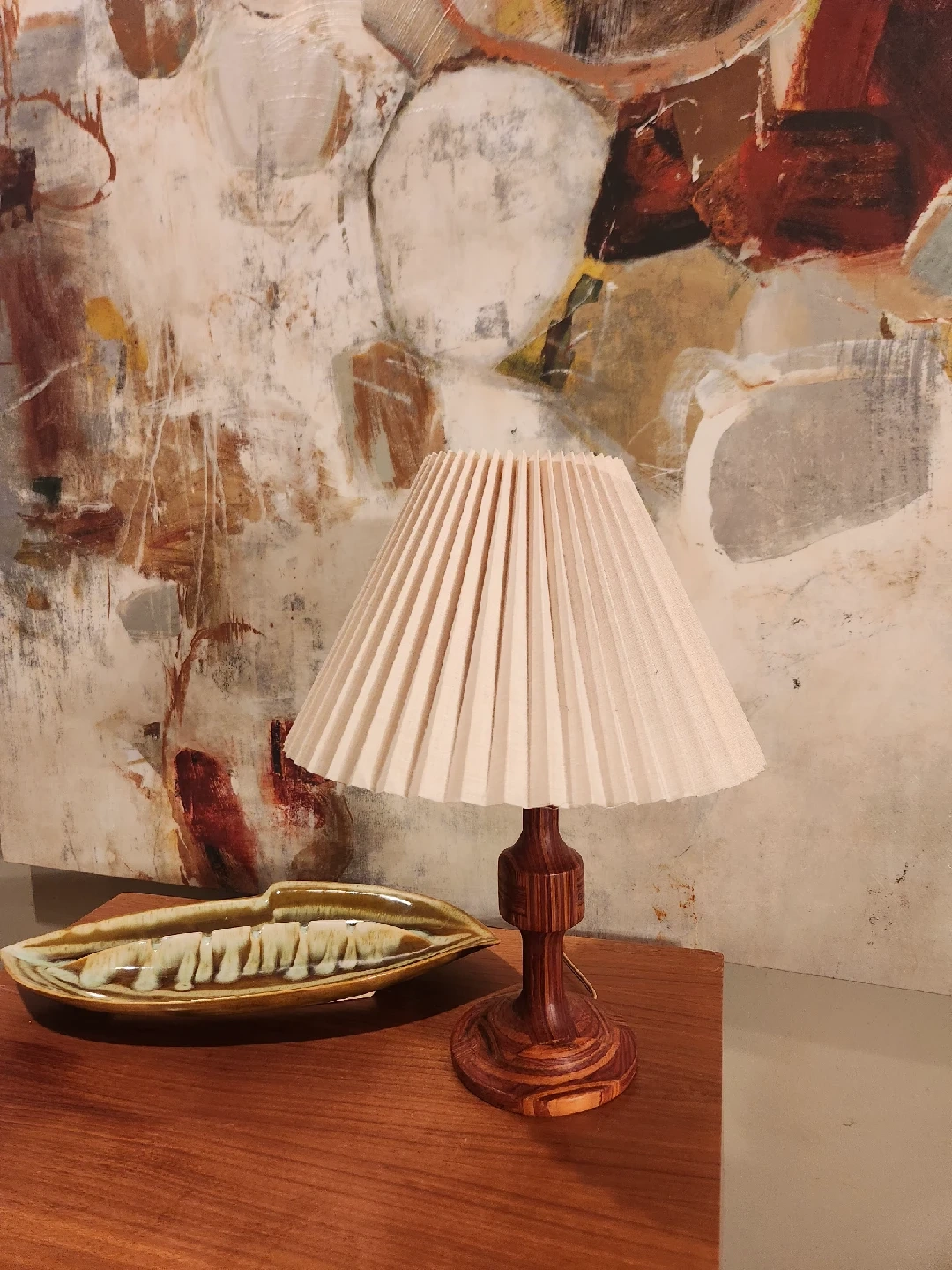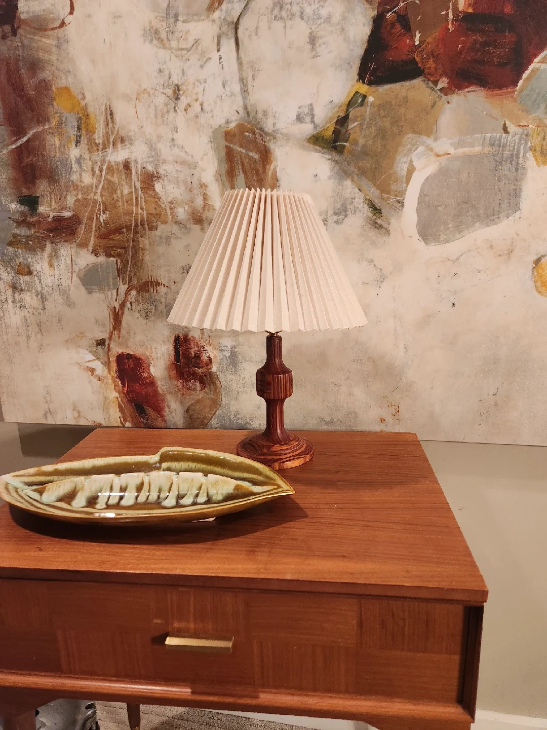 Selling a charming mid-century modern table lamp with a beautiful wood base and pleated lampshade. It would be a great addition to any room! 16 inches high