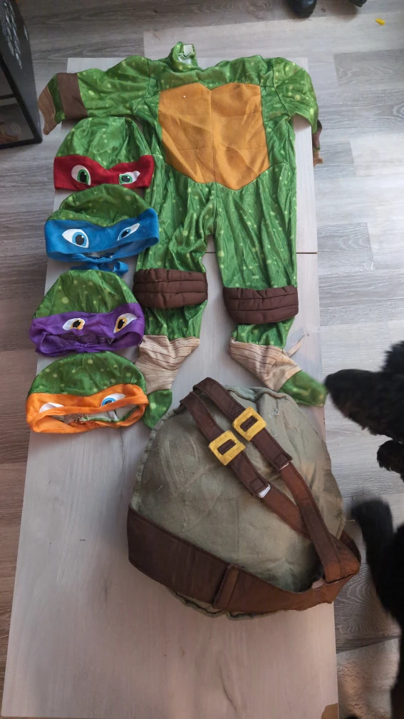 Selling a toddler-sized Teenage Mutant Ninja Turtle costume! Includes the jumpsuit, shell/backpack, and all four headbands (Leonardo, Raphael, Michelangelo, and Donatello). Made of 100% polyester.
