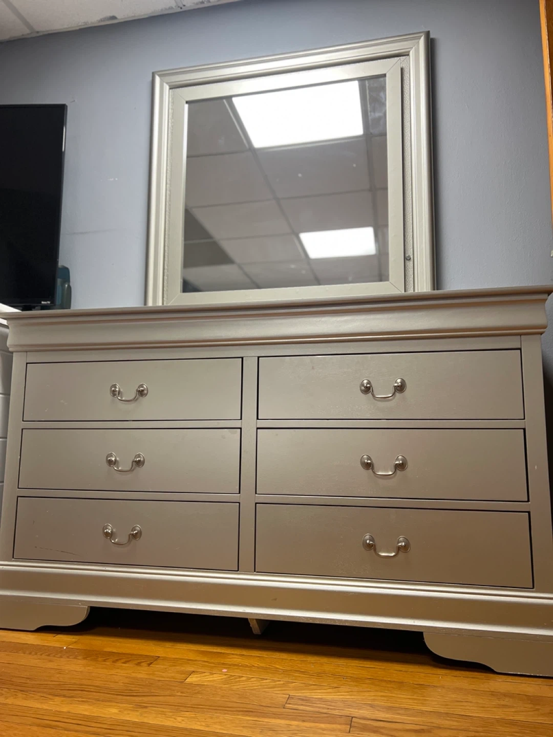 Selling a lovely silver dresser that comes with a matching mirror! It features six spacious drawers, providing ample storage. The dresser is in good condition and would be a great addition to any bedroom
