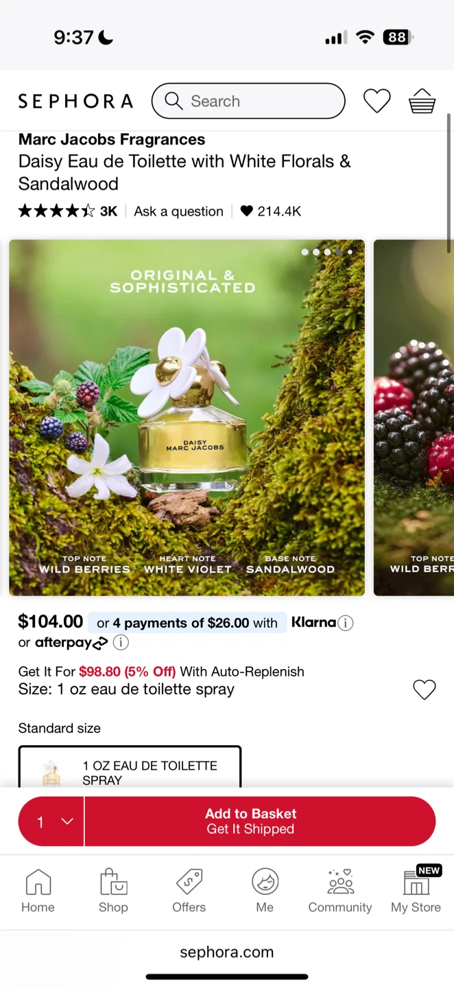 Selling a Marc Jacobs Daisy Eau de Toilette. It is a 30 ml eau de toilette spray. The original price was $104. It has top notes of wild berries, a heart note of white violet, and a base note of sandalwood. 95% full