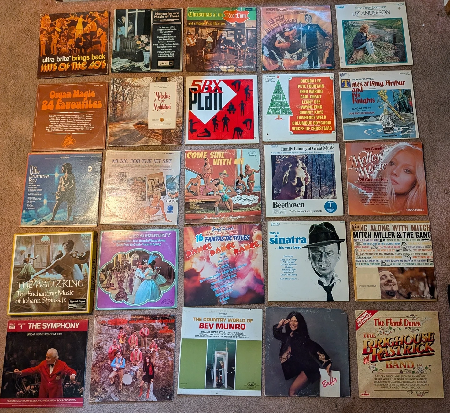 Selling a collection of vintage vinyl records and a record player. The records are a mix of genres and artists. The record player is a vintage model in a carrying case, showing signs of wear but still functional. Great for collectors or anyone looking to enjoy classic music on vinyl