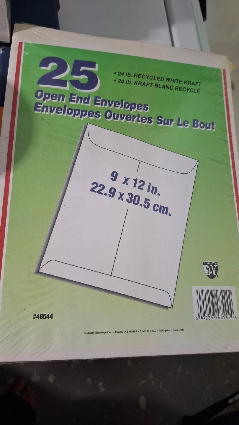 1000+Selling a new pack of Nobility Open End Envelopes. The pack contains 25 envelopes, each measuring 9 x 12 inches (22.9 x 30.5 cm). They are made from 24 lb recycled white kraft paper, still sealed in the original packaging