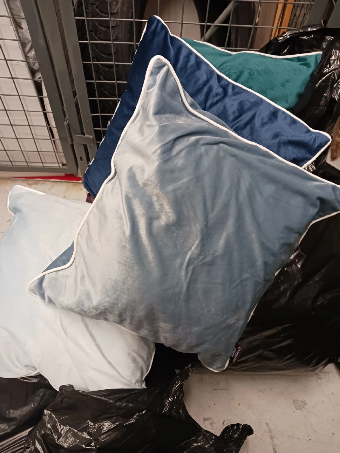 These Brandeco velvet throw pillows are in great condition! They come in a variety of colours: teal, light blue, dark blue, and grey. They're soft and would look great on a couch or bed