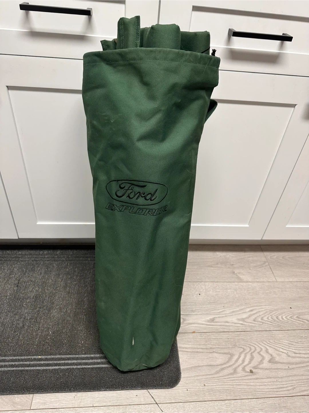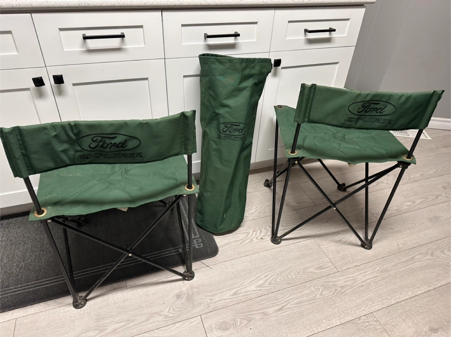 Selling a set of two Ford Explorer camping chairs! They're green and come with a carrying bag for easy transport and storage. Perfect for your next outdoor adventure or backyard BBQ