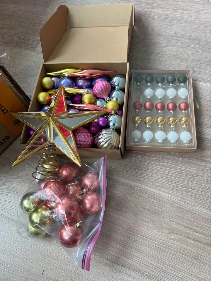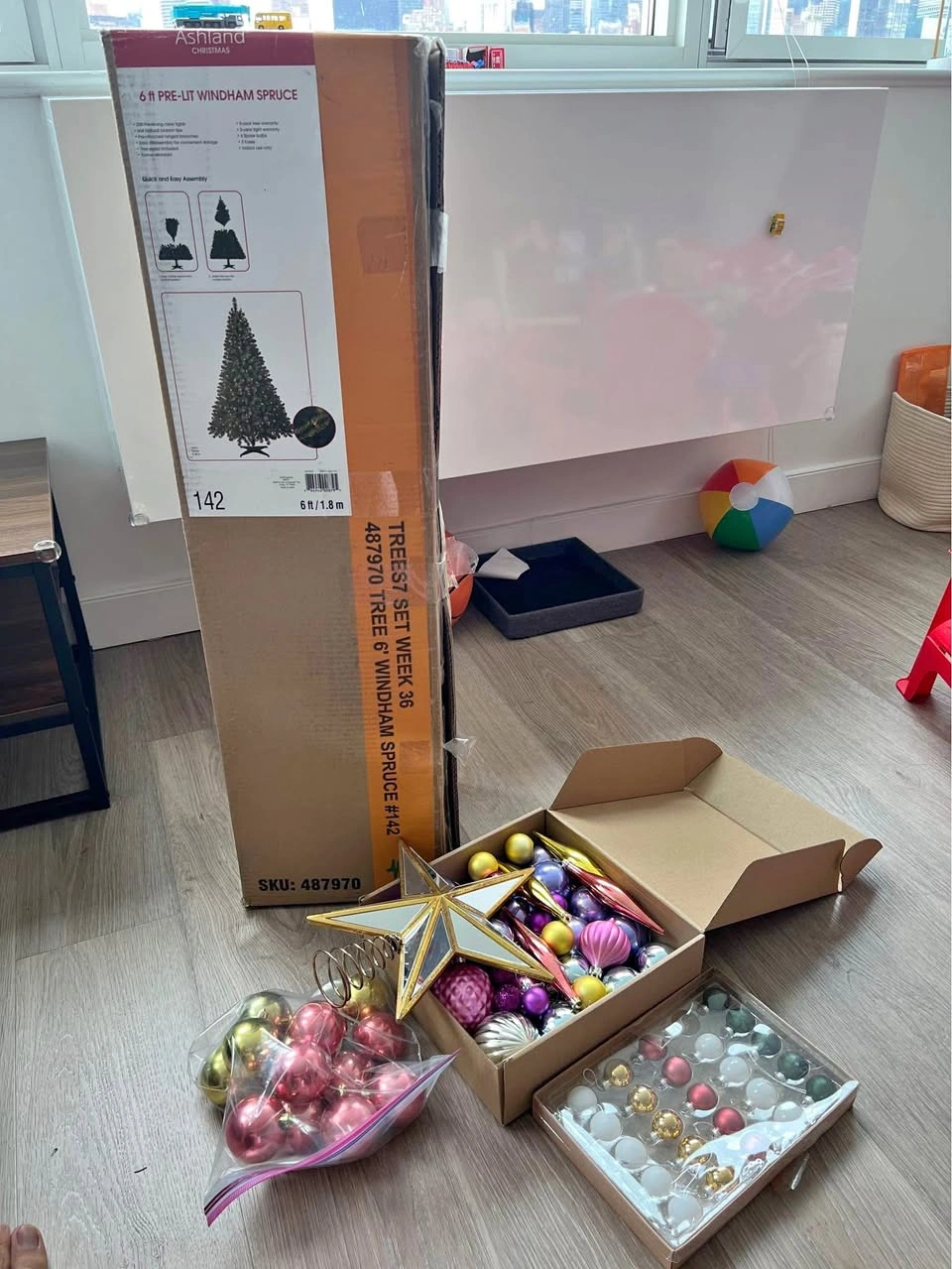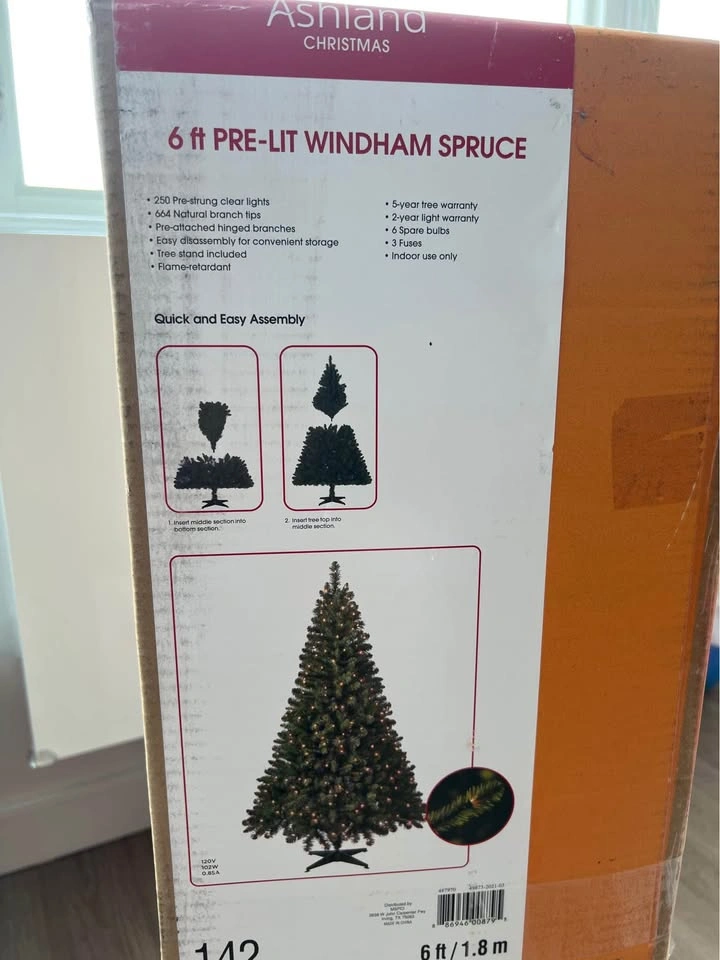 Christmas tree pre lit 6 ft tall with three boxes of ornament and star topper.