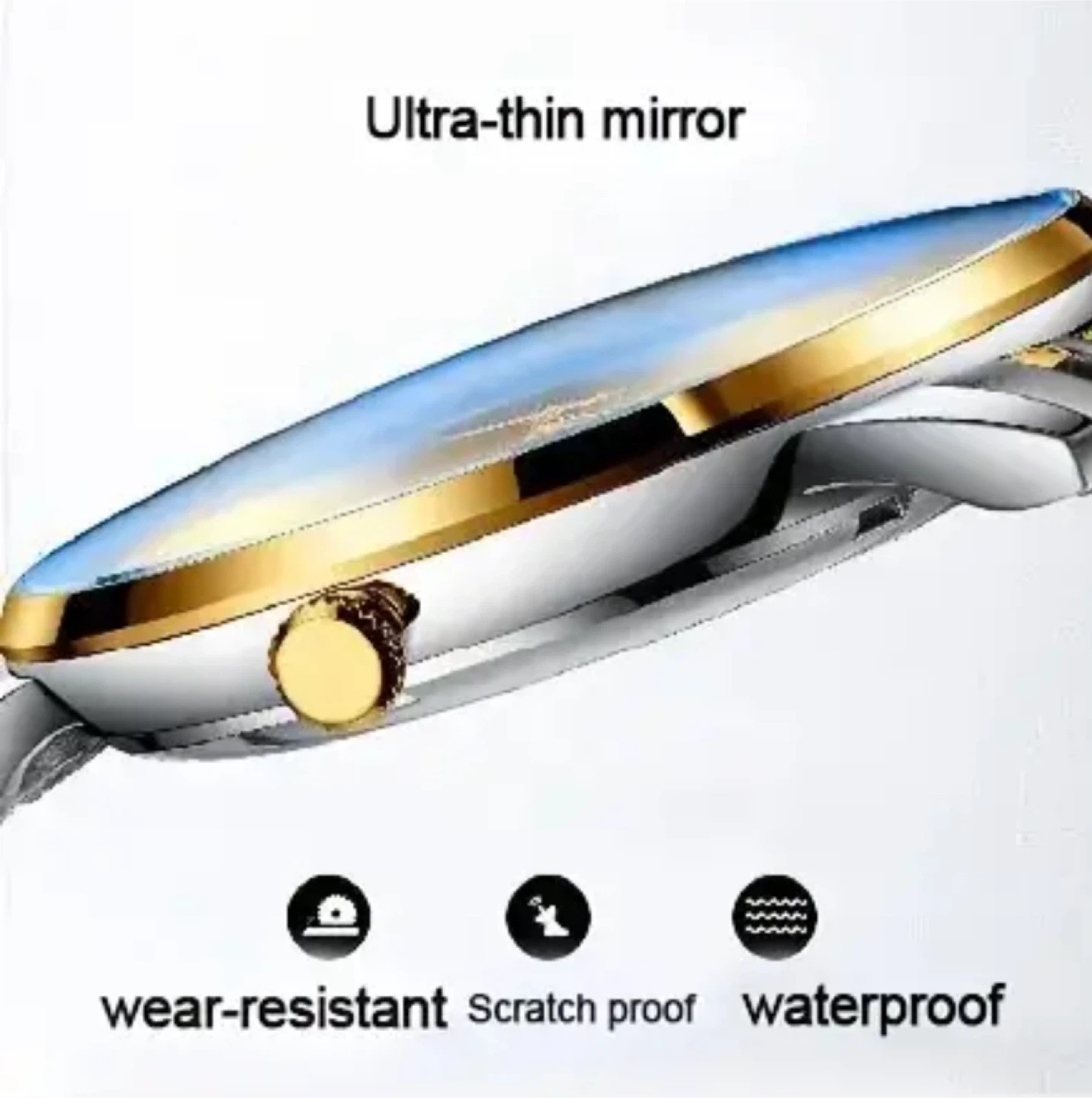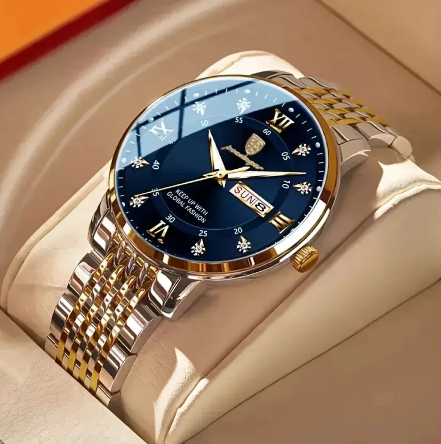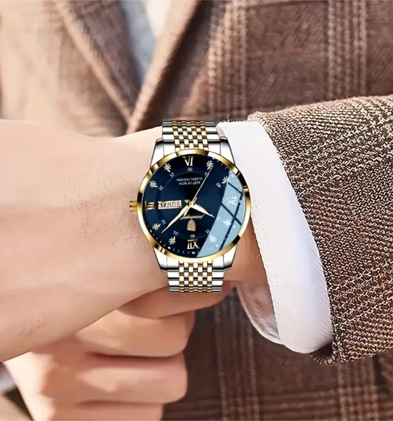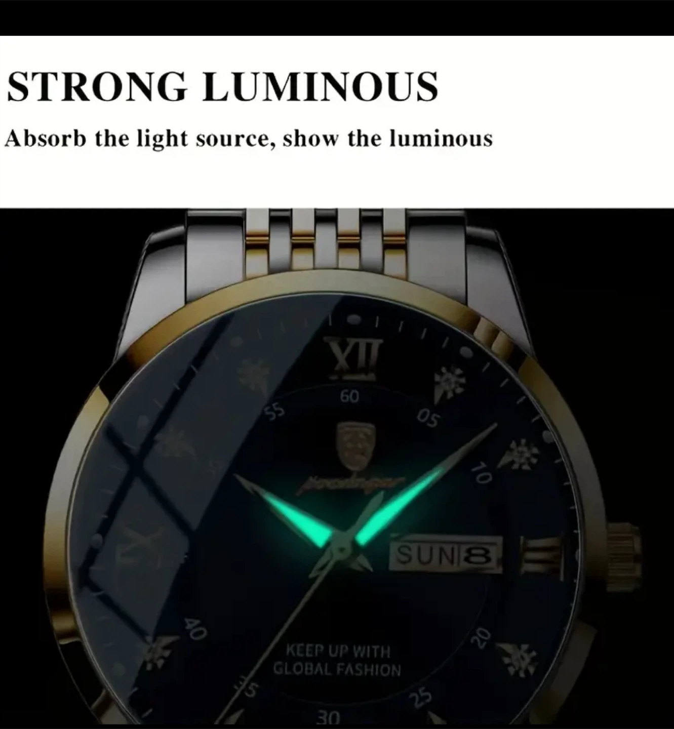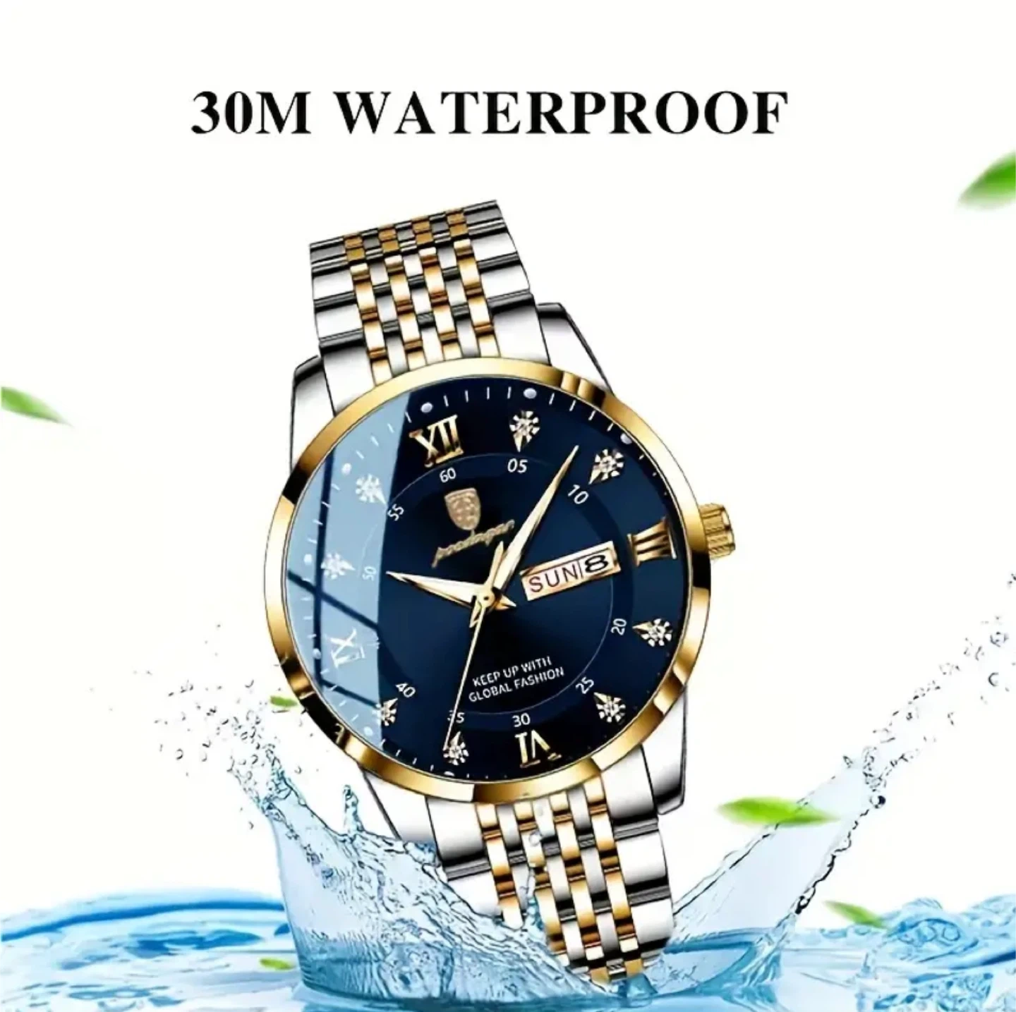 This men's watch features a stylish gold and silver design. It's 30M waterproof and has a luminous display, making it easy to read in the dark. It’s a Men'S Luxury Casual Waterproof Luminous Calendar Round Pointer Quartz Watch.